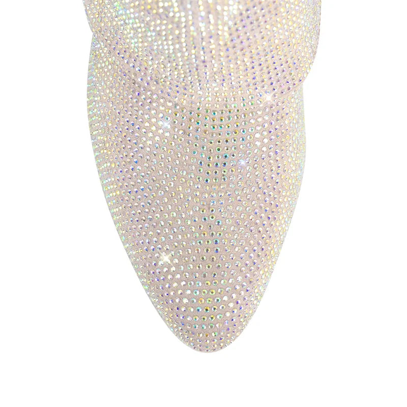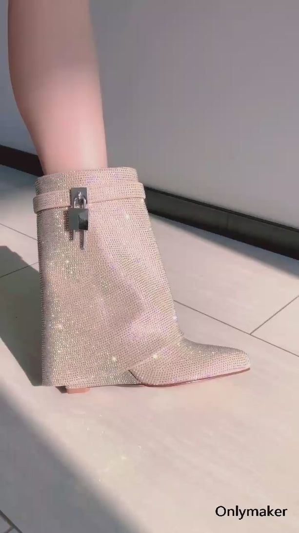 Women Rhinestone Fold Over Lock Shark Skirt Boots Pointed Toe Heel Thick High Heel Female Booties