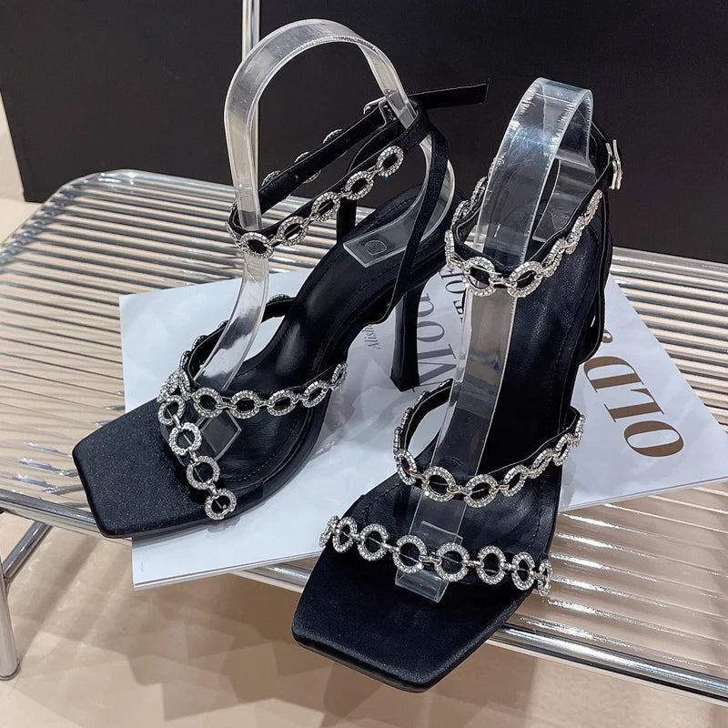 Rivet Crystal Narrow Band Summer Sandals Women High Heels Buckle Strap Square Toe Pole Dancing Dress Ladies Shoes