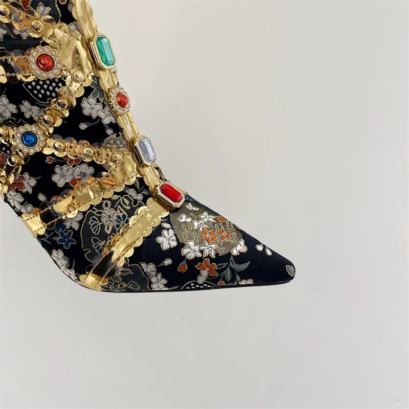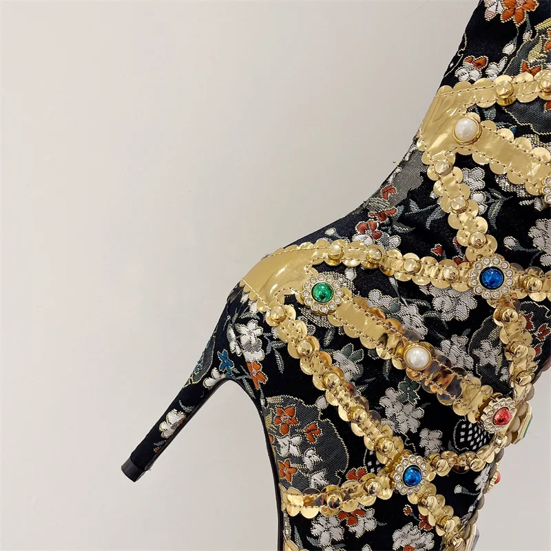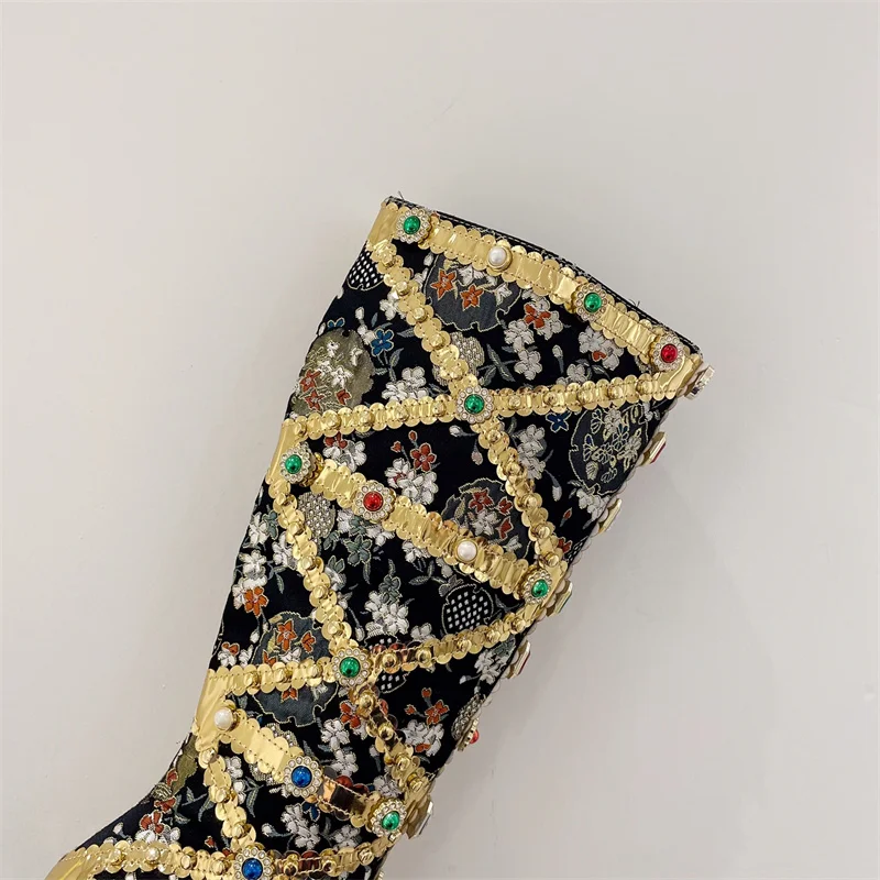 Runway Fashion Color Gem Knee High Boots Women Handwork Embroider Sexy Pointed Toe Zip Party Stripper Heels Shoes Booties