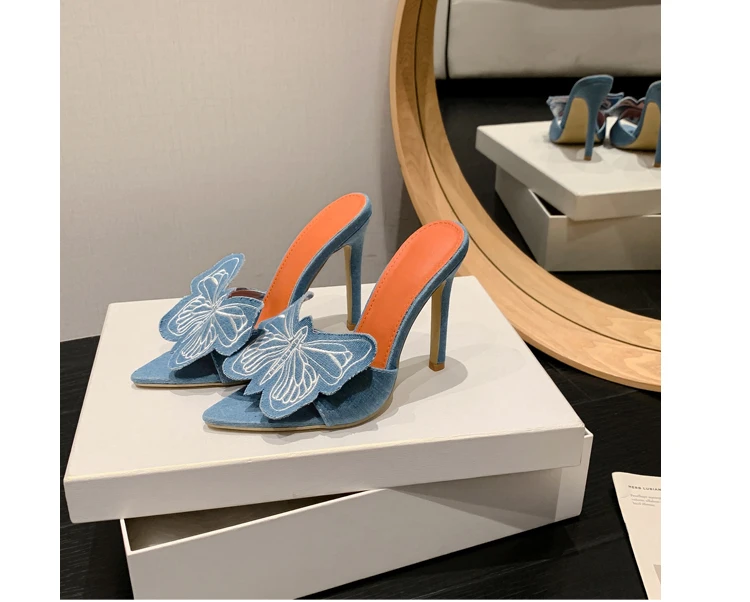 Sexy Denim Butterfly Flower Thin Heels Slipper Women Summer Fashion Pointed Toe Slides Stripper Party Mule Shoes