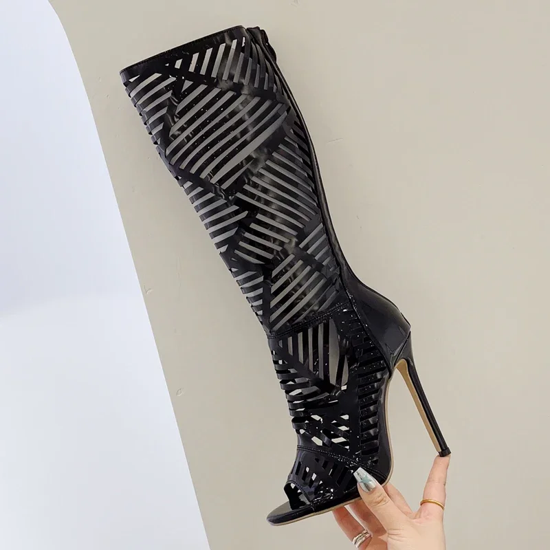 Sexy Hollow Out Knee-High Boots Sandals Women Open Toe Shoes Fashion Thin High Heels Pole Dancing Female Shoes
