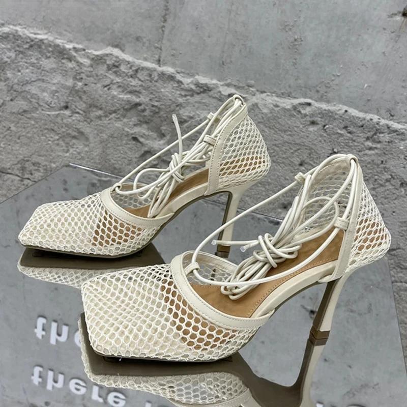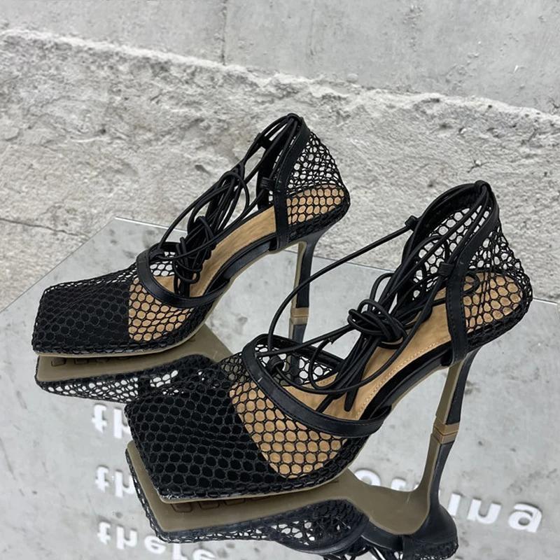 Sexy Mesh Pumps Sandals Female Square Toe High Heel Lace Up Cross-tied Stiletto Hollow Dress Shoes Size 35-42
