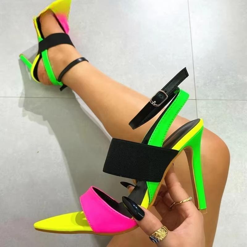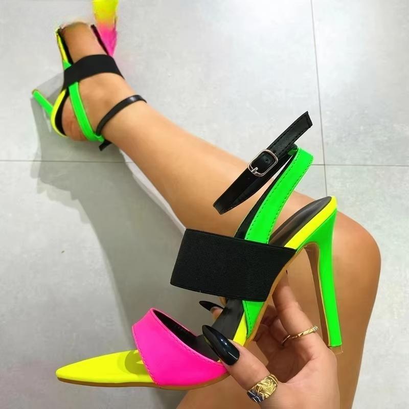 Sexy Pointed Toe High Heels Women Sandal Fashion Mixed Color Buckle Strap Slides Summer Party Stripper Shoes Sandalias