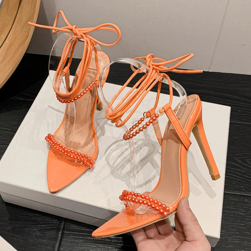 Sexy Pointed Toe Thin Heels String Bead Women Sandal Fashion Ankle Strap Summer Party Stripper Shoes Zapatillas De Mujer