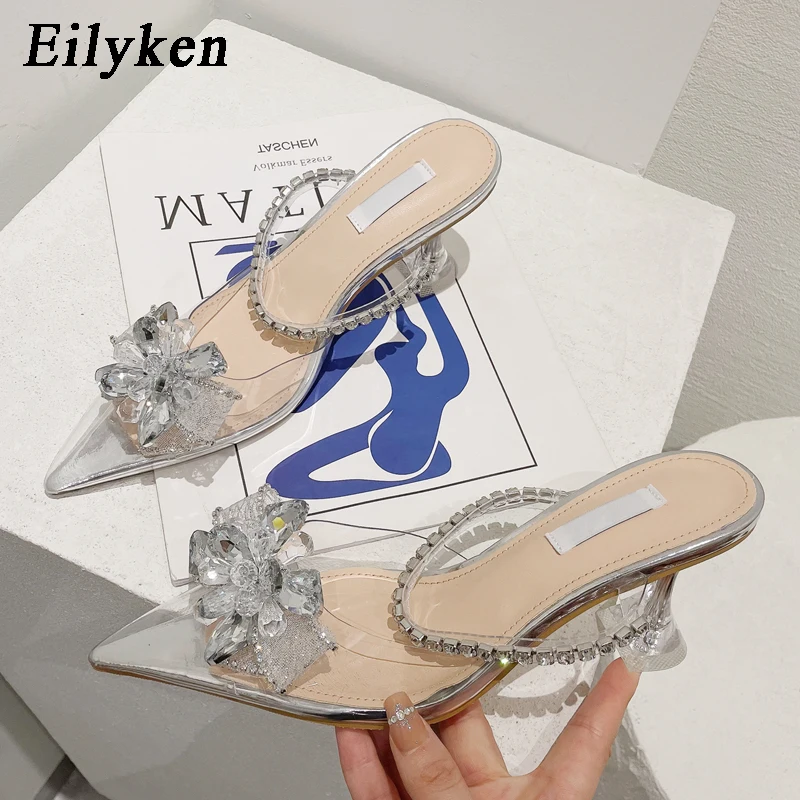 Sexy Silver String Bead Crystal Buckle Women Pumps Pointed Toe Low Heels PVC Transparent Sandals Wedding Prom Shoes