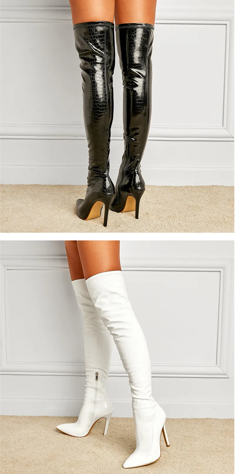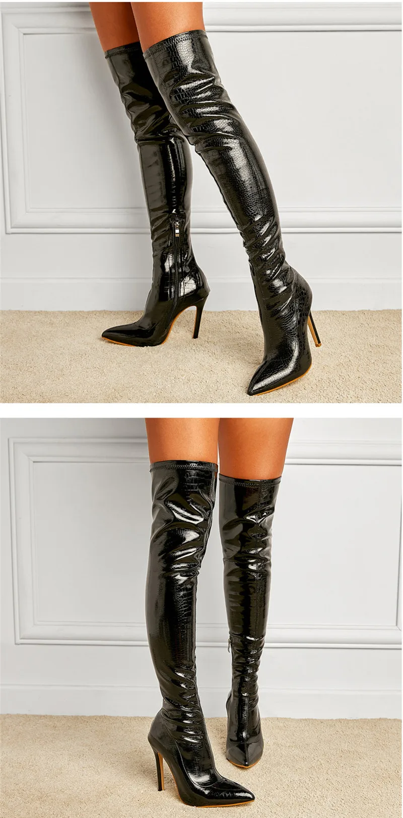 Sexy Snake Print Patent Leather Pointed Toe Women Nightclub Stripper Over The Knee Boots Fashion Zip Stiletto Heels Shoe