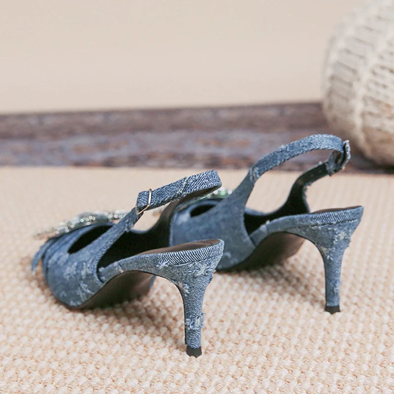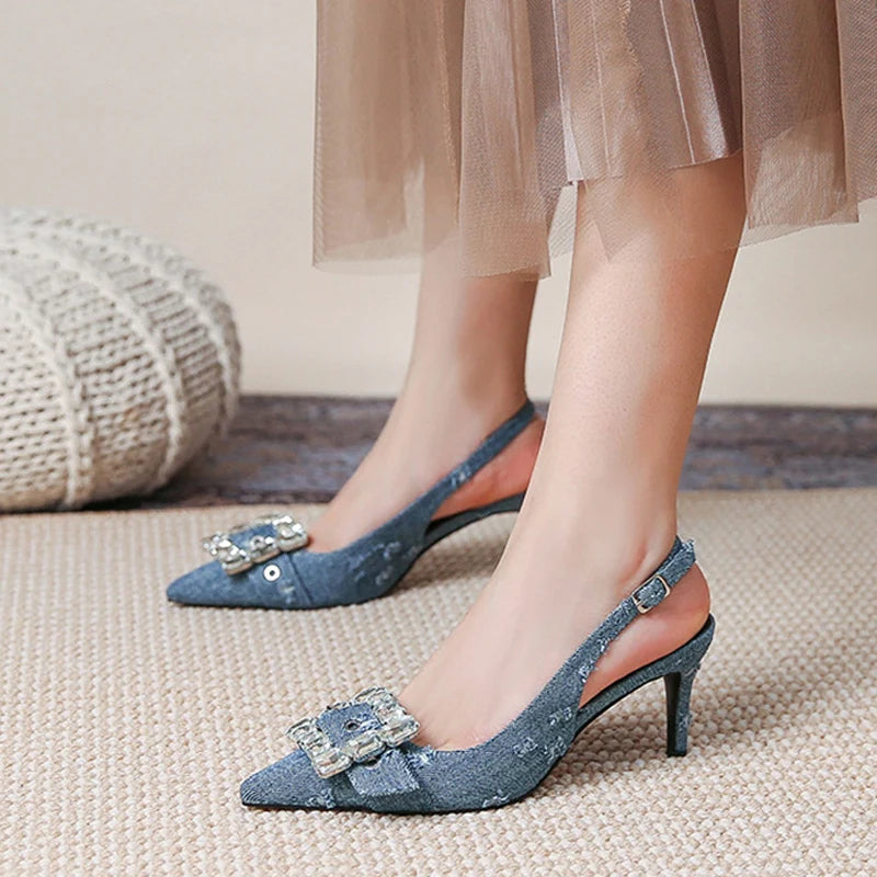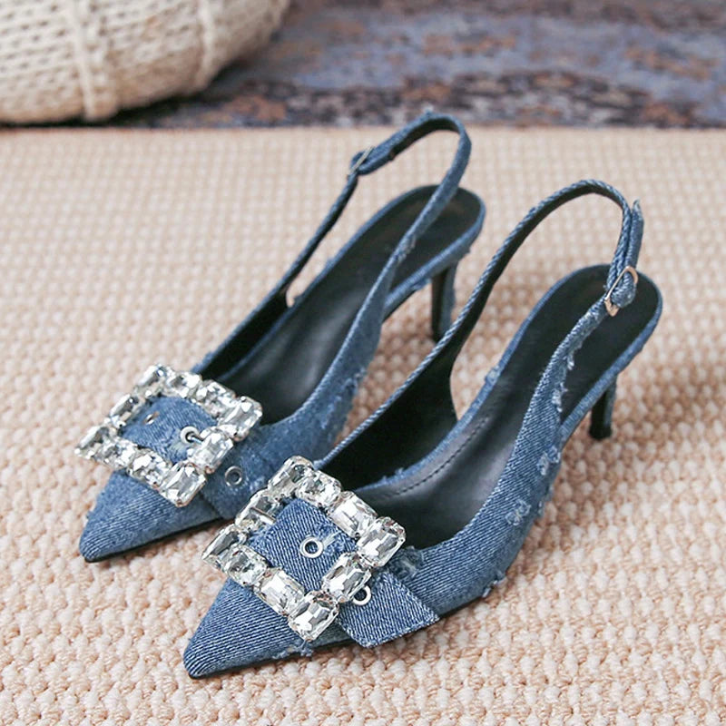 Slingback Sandals Women Fashion Crystal Buckle Pointed Toe Blue Denim High Heels