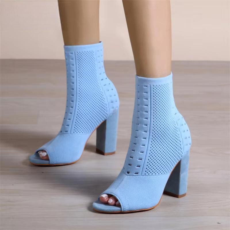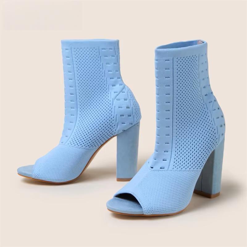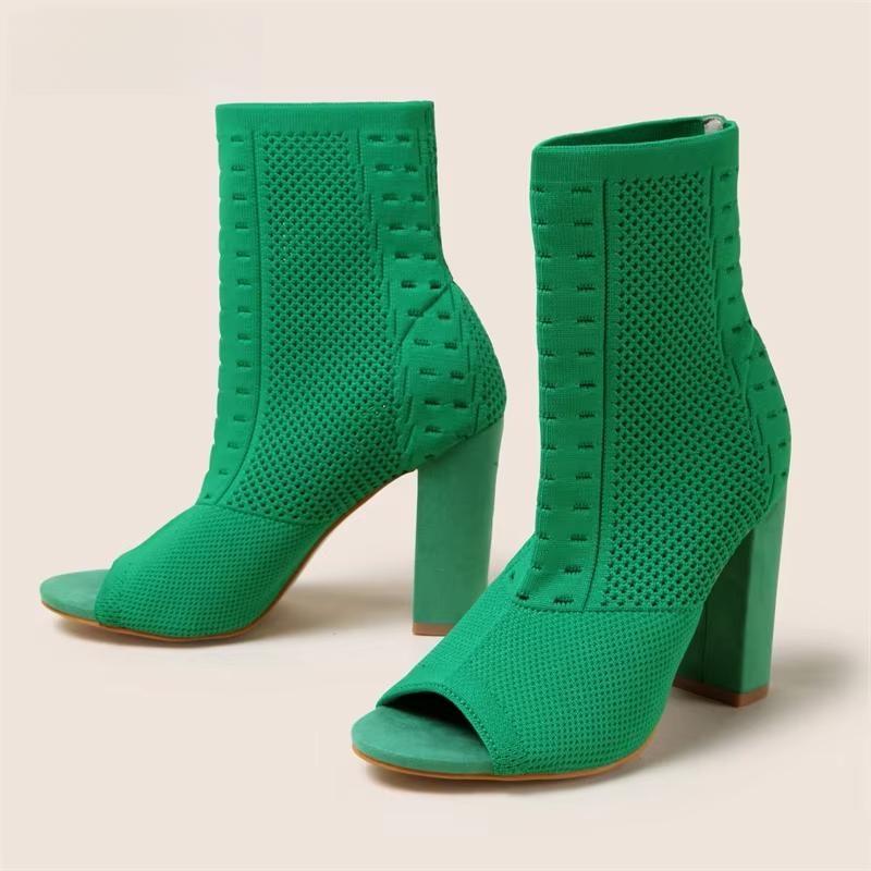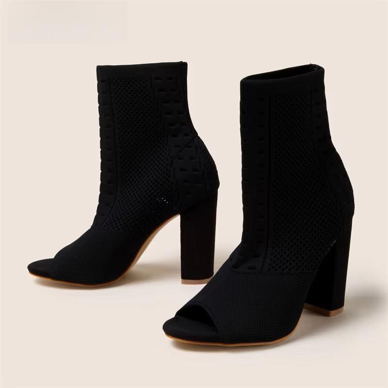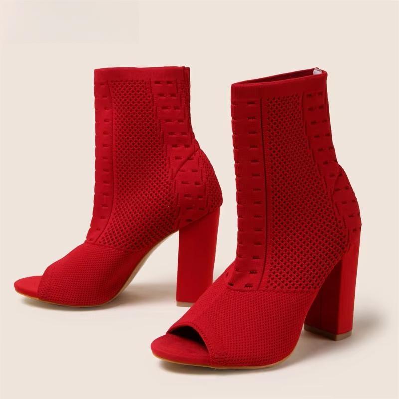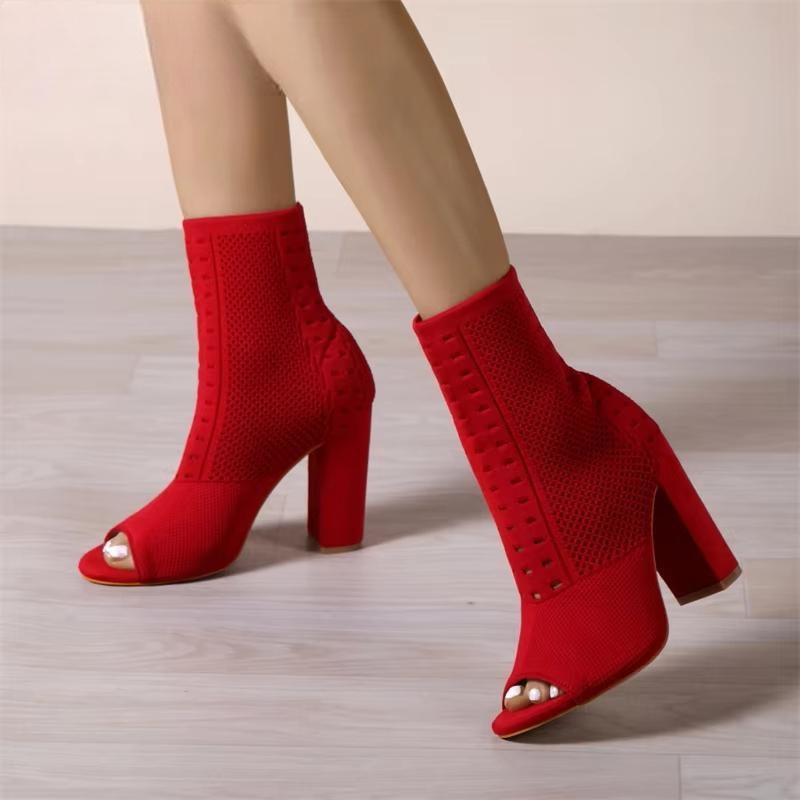Spring Autumn Fashion Peep Toe Knitted Stretch Fabric Socks Boots Women Square High Heels Dance Shoes Zapatos De Mujer