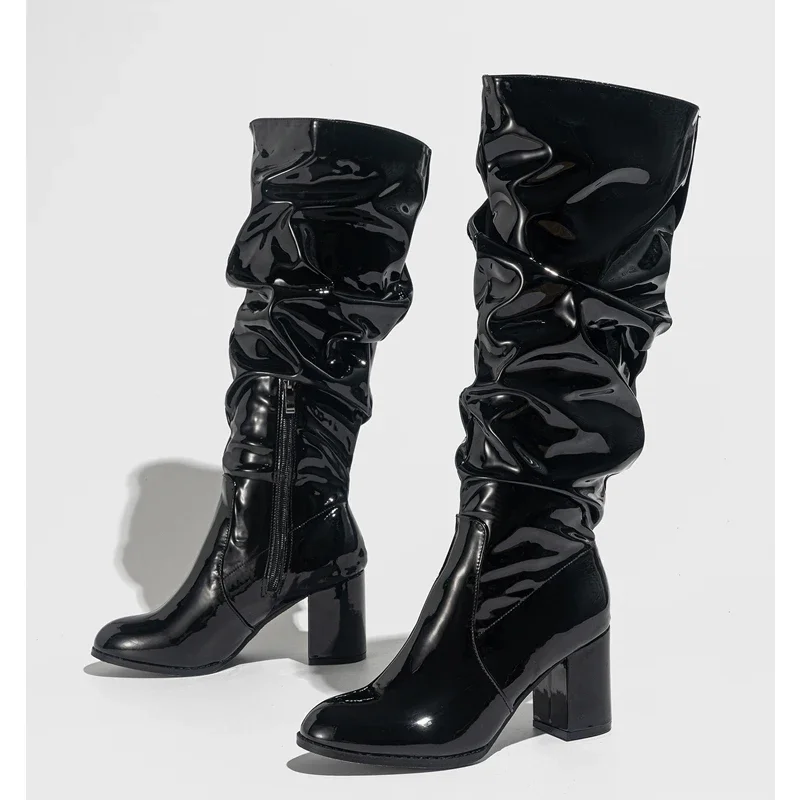 Spring Autumn Fashion Pleated Round Toe Women Knee-High Boots Zipper Square High Heels Party Ladies Shoes Botas Mujer