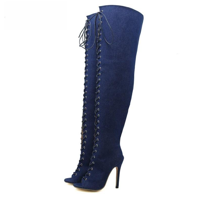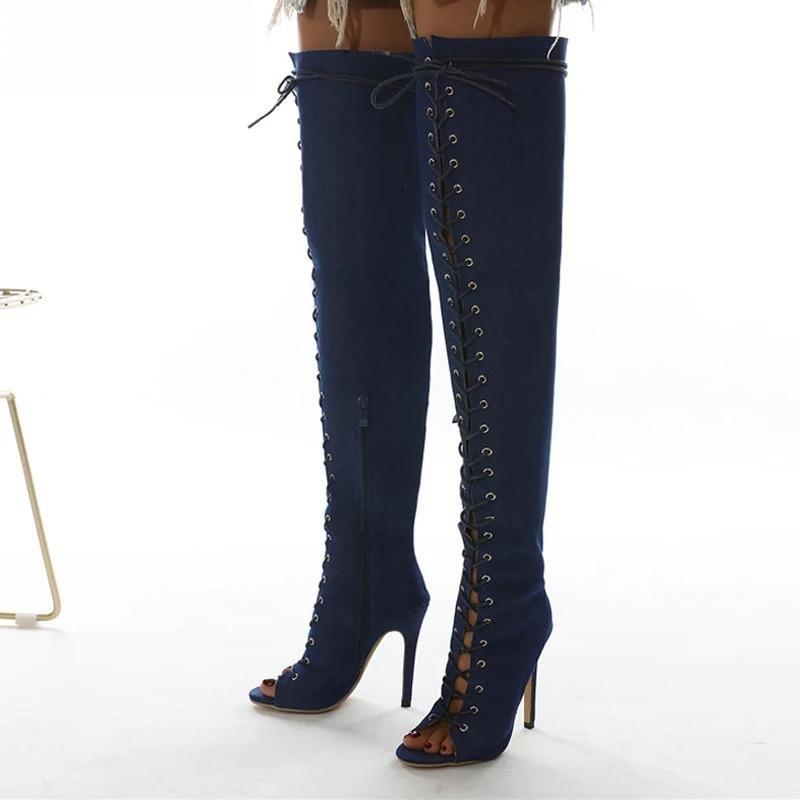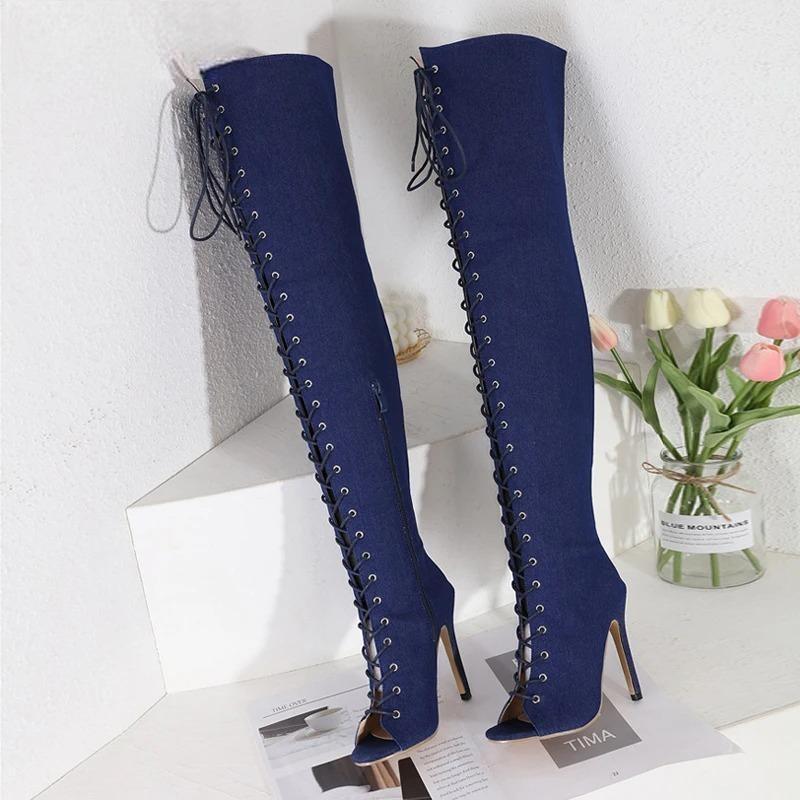 Spring Autumn Peep Toe Hollow Out Over-the-Knee Boots Women Fashion Sexy T-tied Stiletto High Heels Motorcycle Shoes