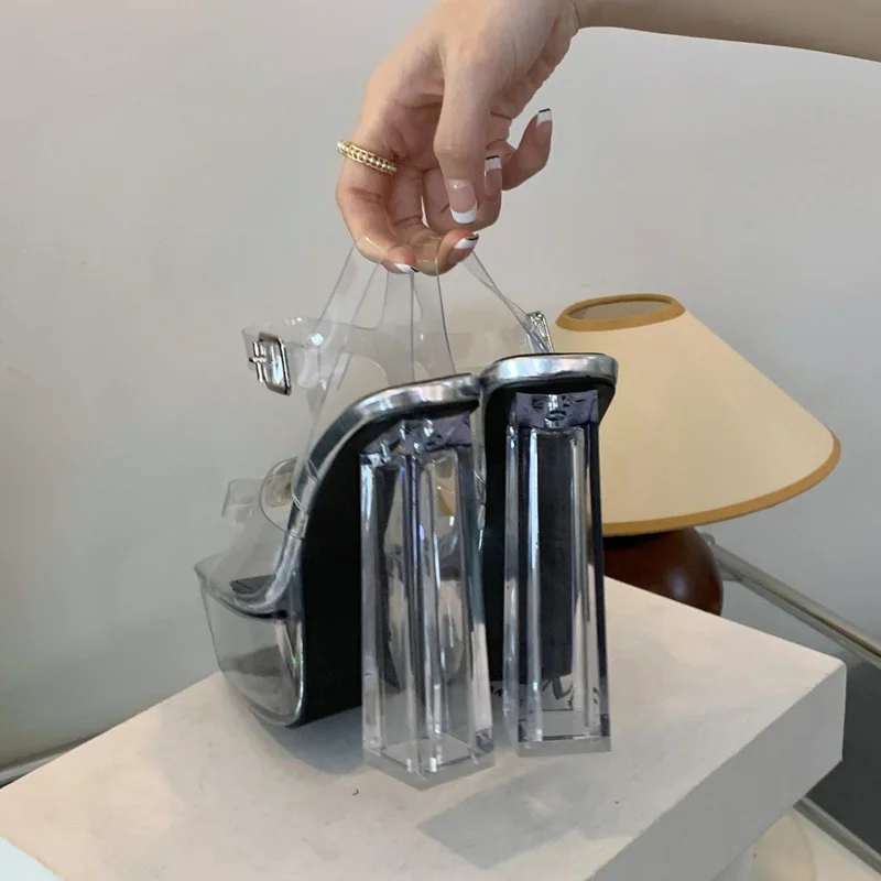 Summer Ankle Buckle Strap Open Toe CRYSTAL Transparen Platform Square Heels Silver Women's Sandals Nightclub Shoes