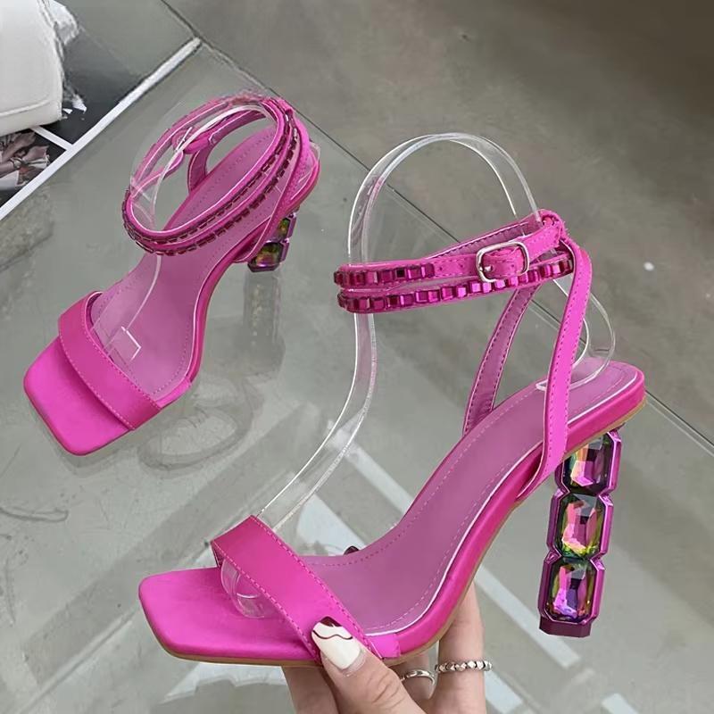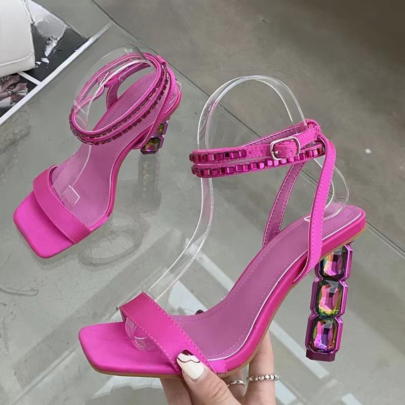 Summer Crystal Embellished High Heel Sandals Women Diamond Open Toe Ankle Strap Silk Satin Rhinestone Banquet Shoes