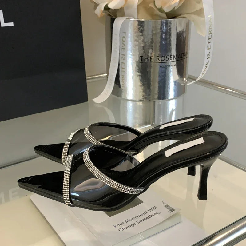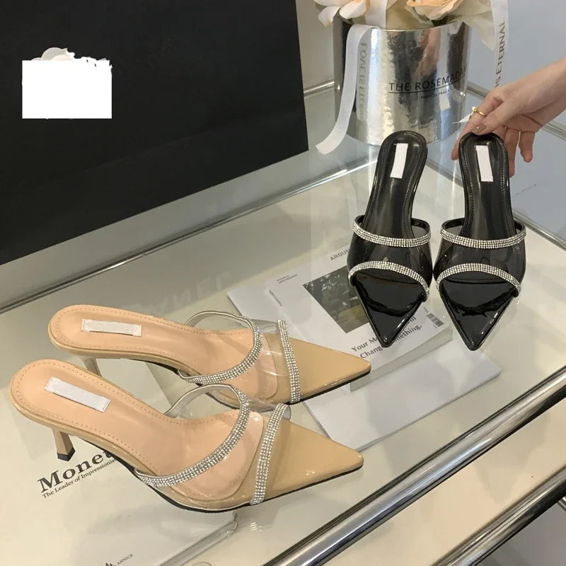 Summer Crystal PVC Transparent Pointed Toe Women Slippers Fashion Thin Heels Sandals Party Dress Slide Shoes