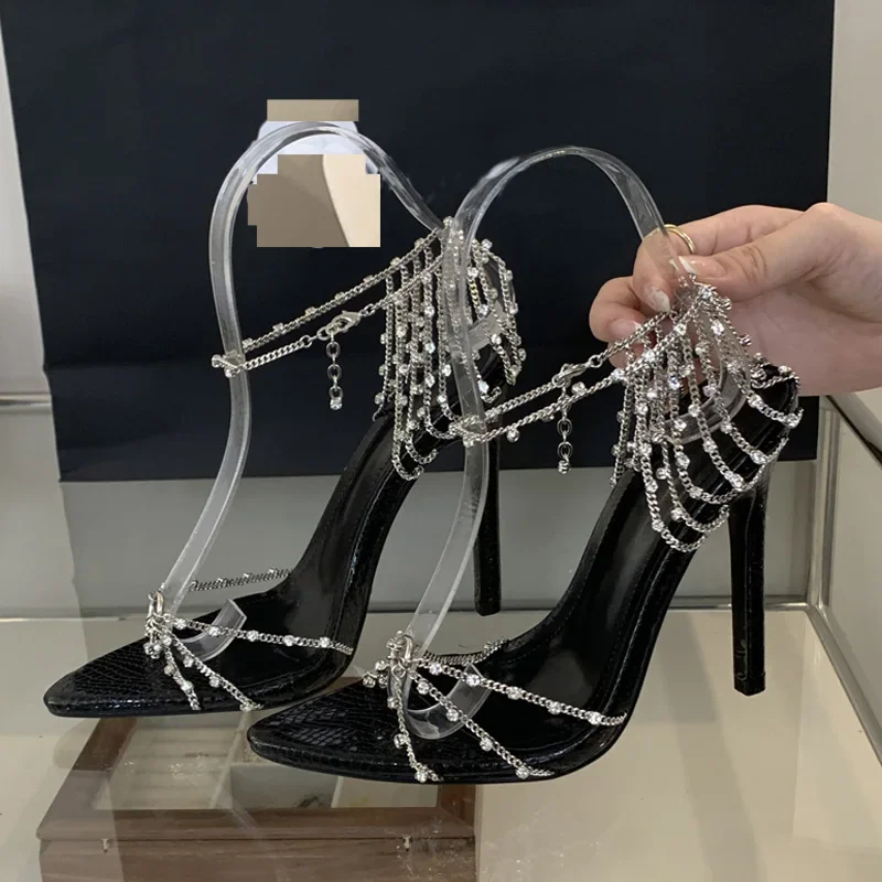 New Summer Design Fringe Chain Buckle Strap Women Sandals Sexy Pointed Toe Thin High Heels Stripper Prom Shoes