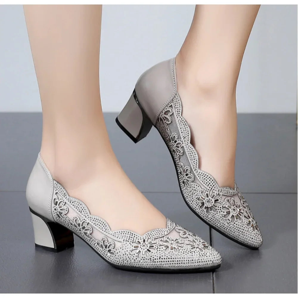 Summer Fashion Hollow Out Genuine Leather Pumps Women Shoes Med Heels Square Diamond Mesh Ladies Office Crystal Pointshoes