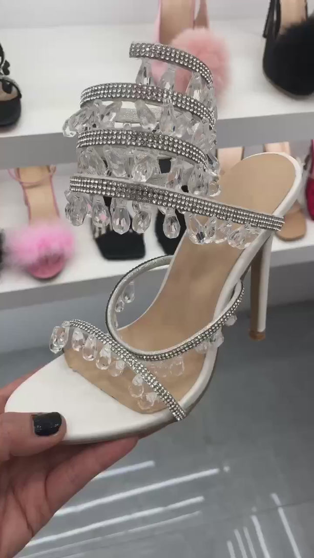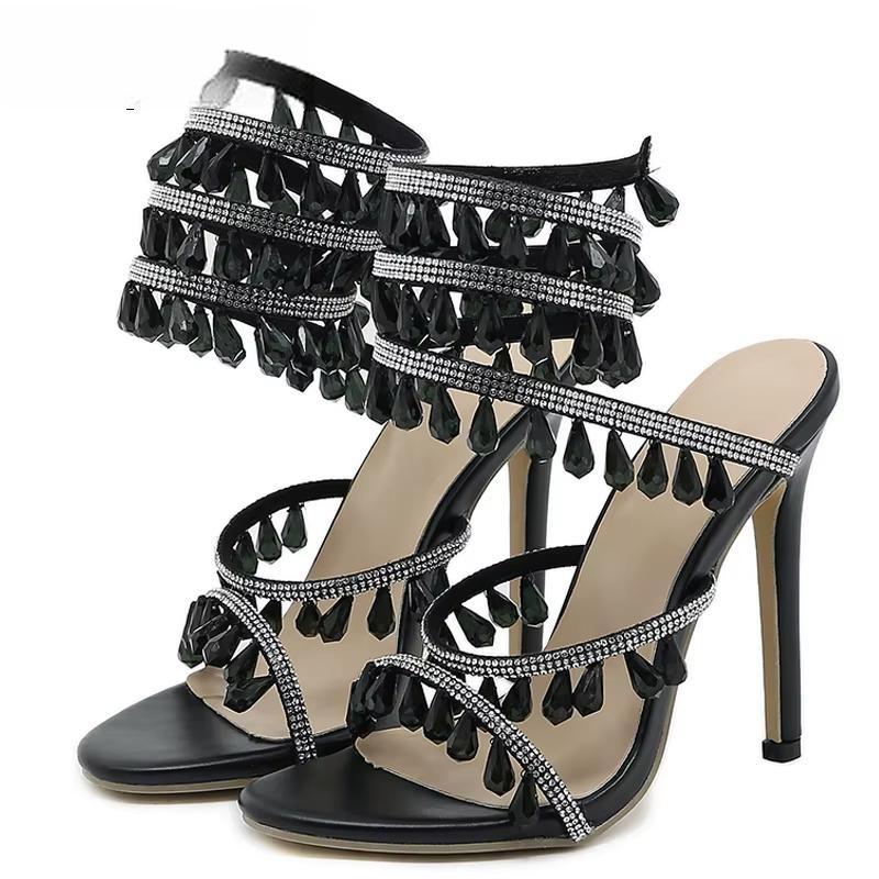 Summer Fashion Rhinestone Crystal Sandals Women's String Bead Banquet Stiletto High Heel Wrap Strap Open toed Shoes