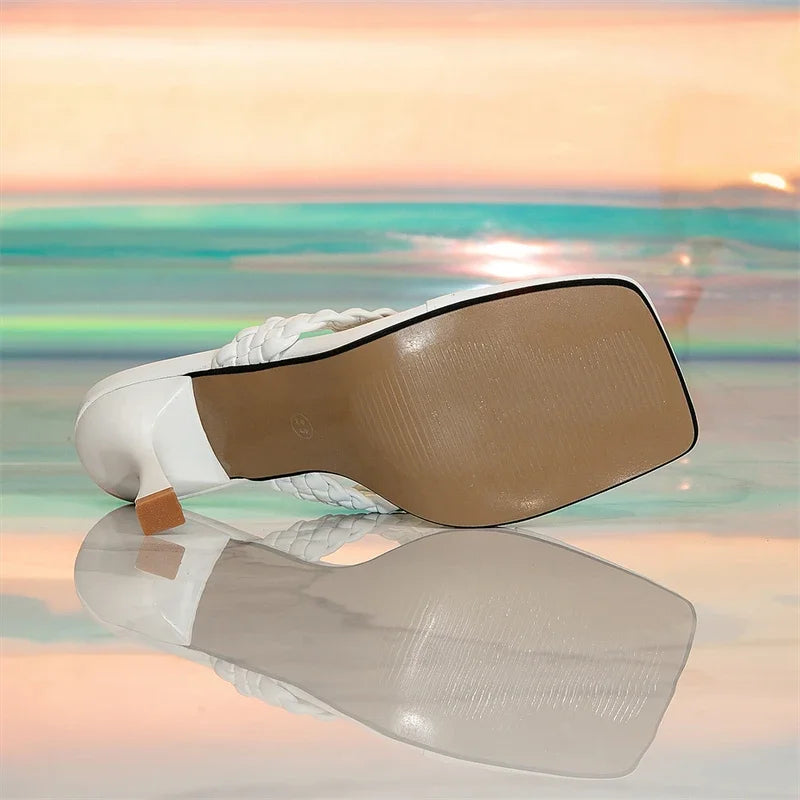 Summer Fashion Weaving Square Clip Toe Women Slippers Thin High Heels White Sandals Flip Flops Slides Shoes