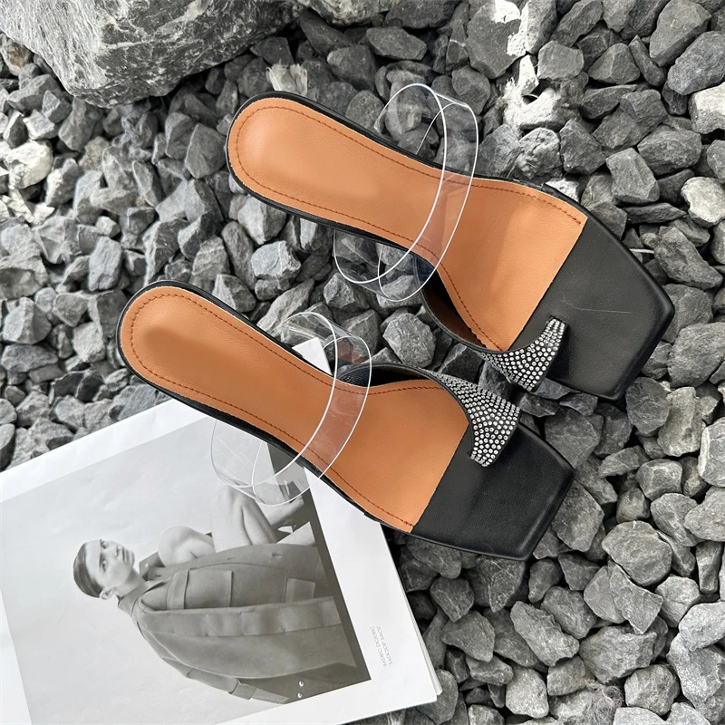 Summer Open Toe Mules High Heels Slippers Female Crystal Rhinestone Sandals PVC Transparent Strap Slides Party Women Shoes