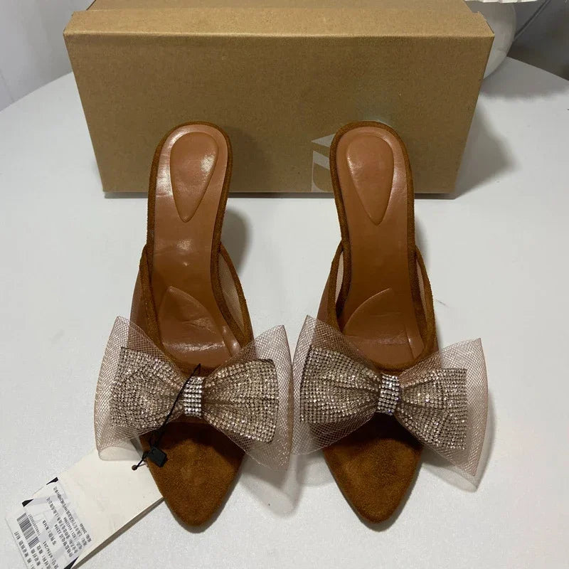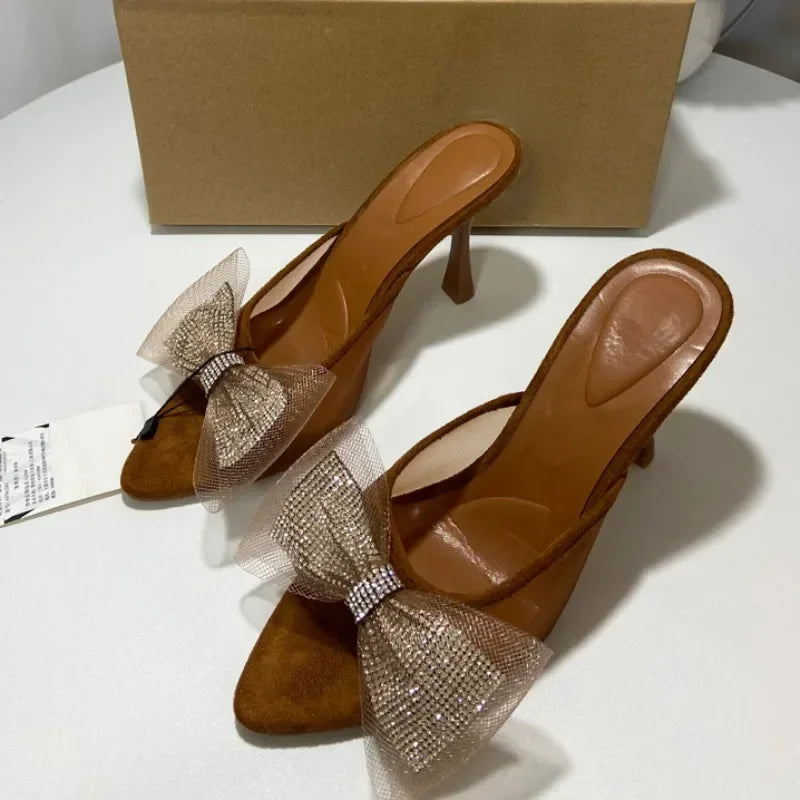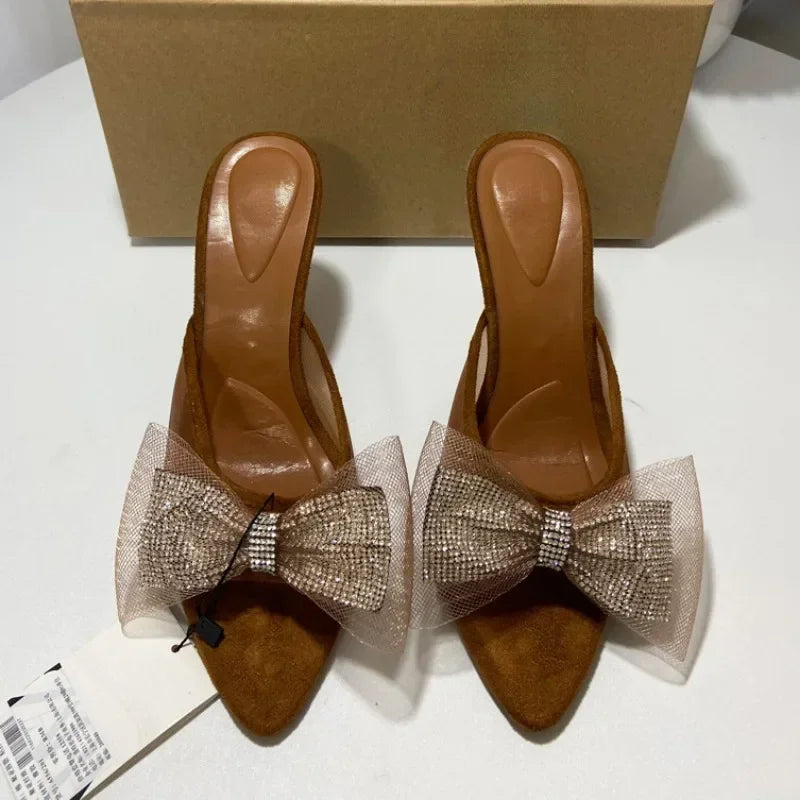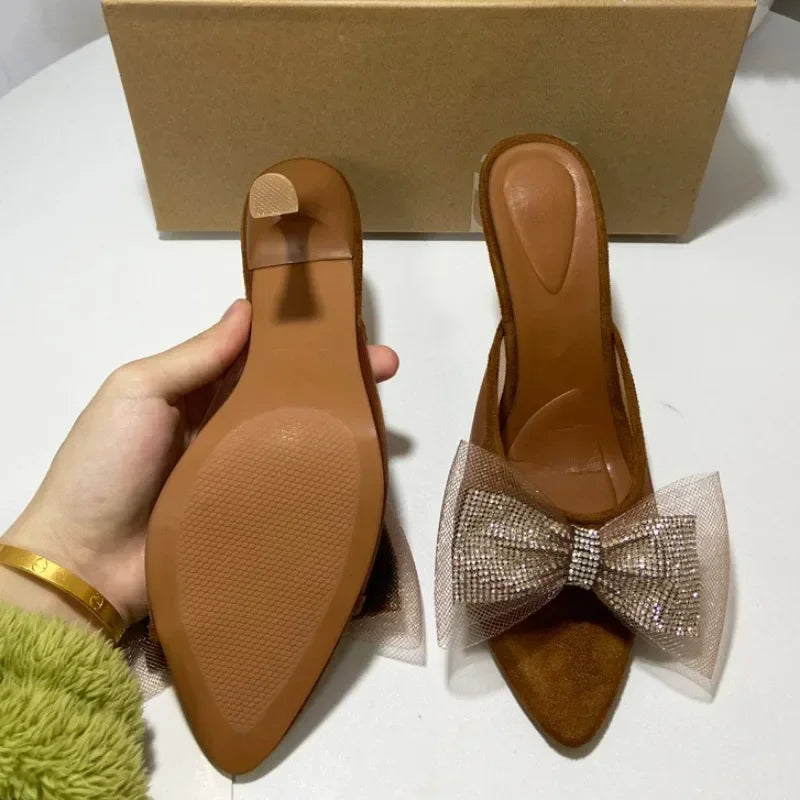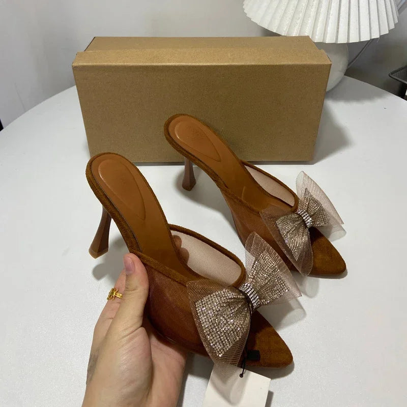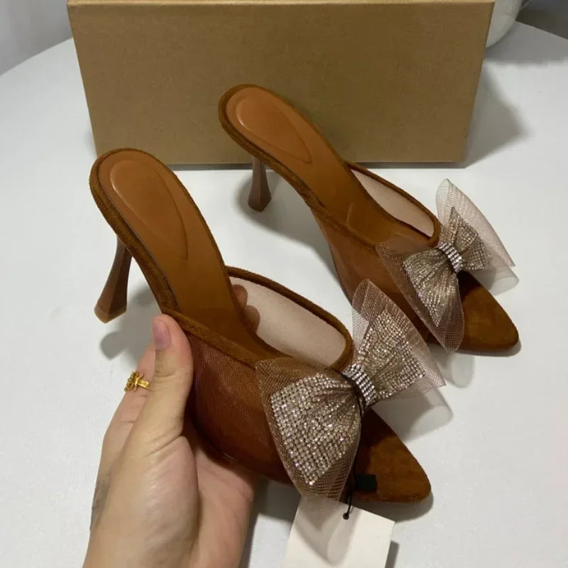 Summer Pointed Shoes Woman Open Toe High Heels Shallow Diamond Shining Butterfly-Knot Slingbacks Mesh Ladies Mules Sandals