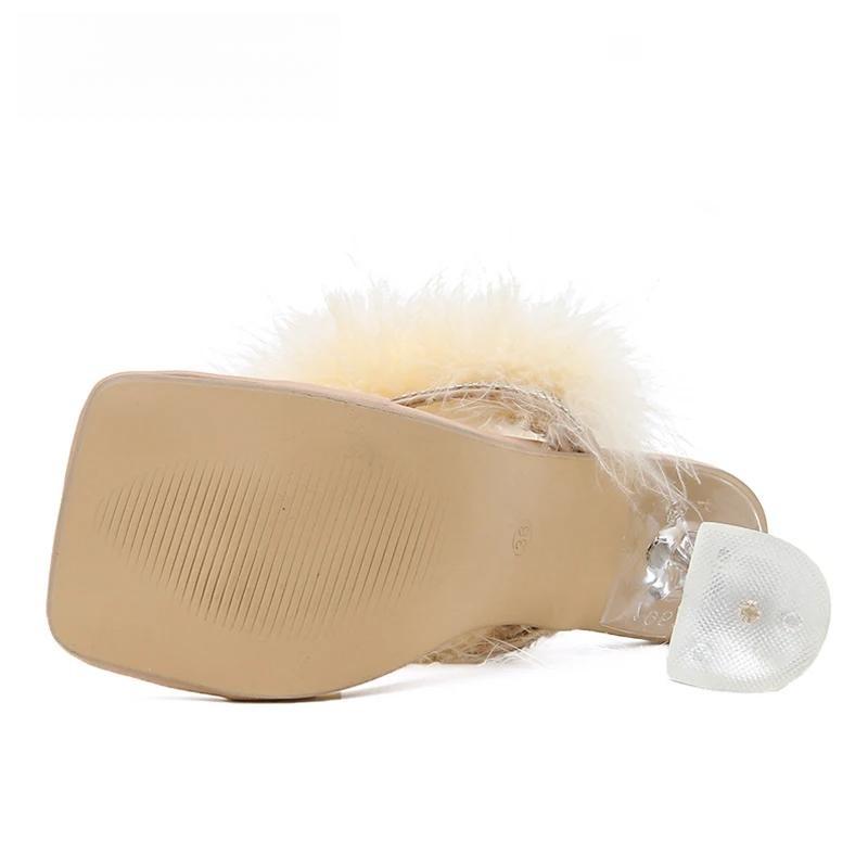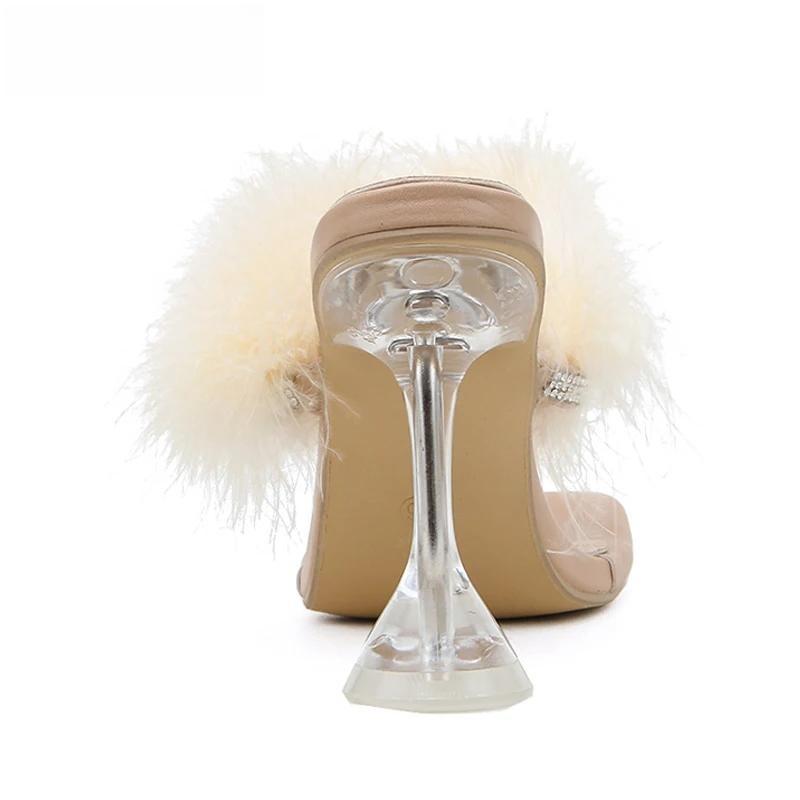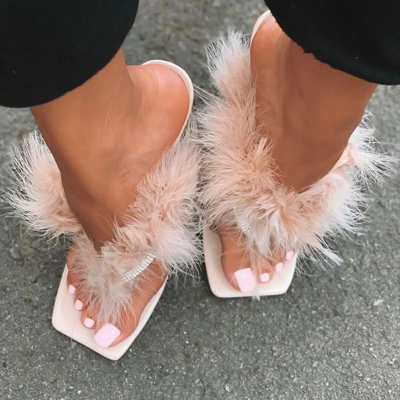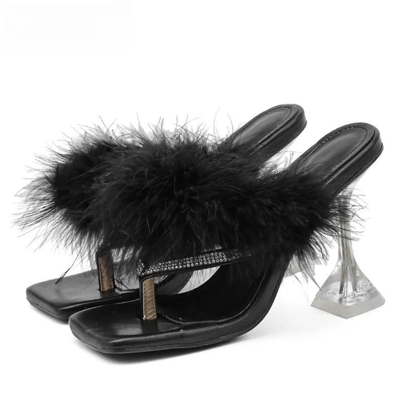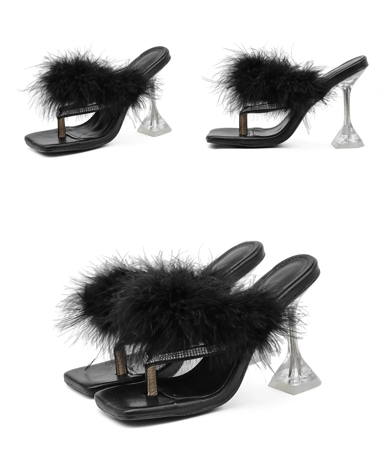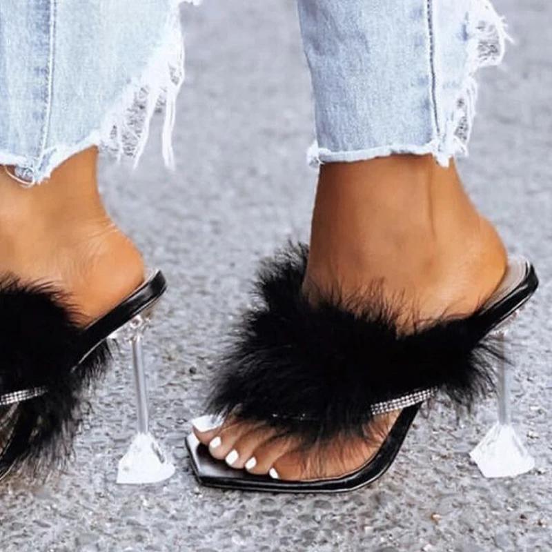 Summer Slippers Women Furry Slides Fashion Square Toe Transparent Perspex Heels Rhinestone Sandals Female Flip Flop Shoe