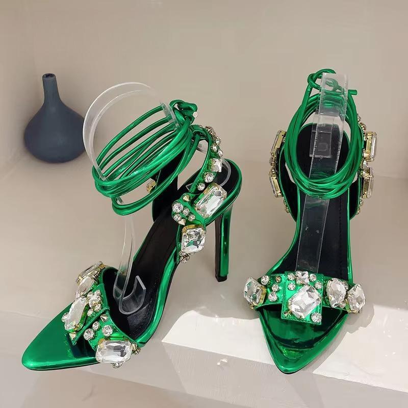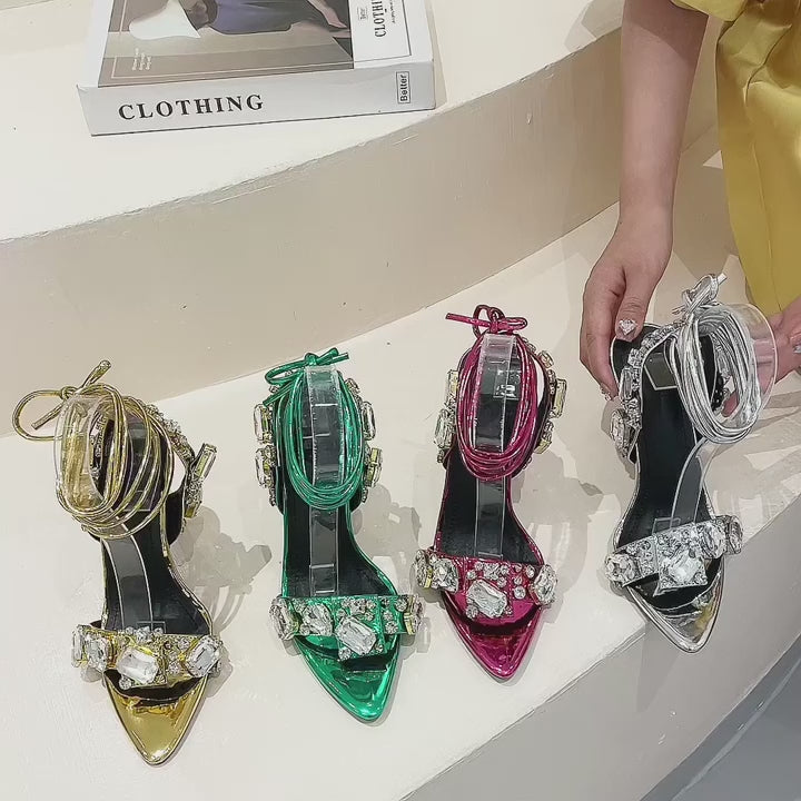 Stilettos Heels Rhinestones Sandals Women Summer Pointed Toe Ankle Strap Crystal Wedding Ladies Shoes Zapatillas mujer