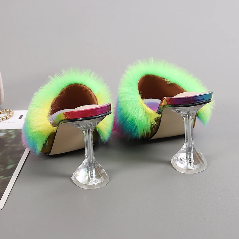 Summer Woman Pumps Transparent Perspex High Heels Fashion Color Feather Fur Peep Toe Mules Slippers Ladies Slides Shoes Sandals