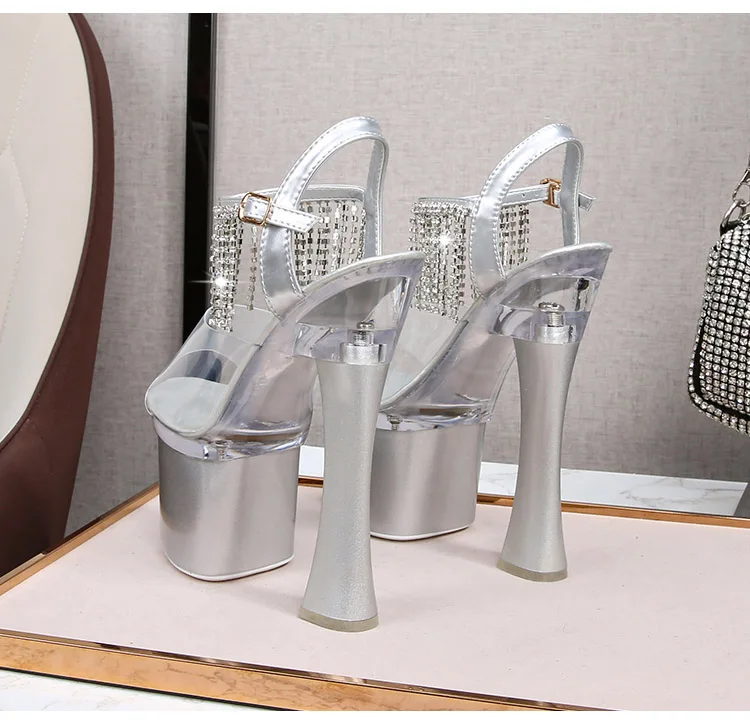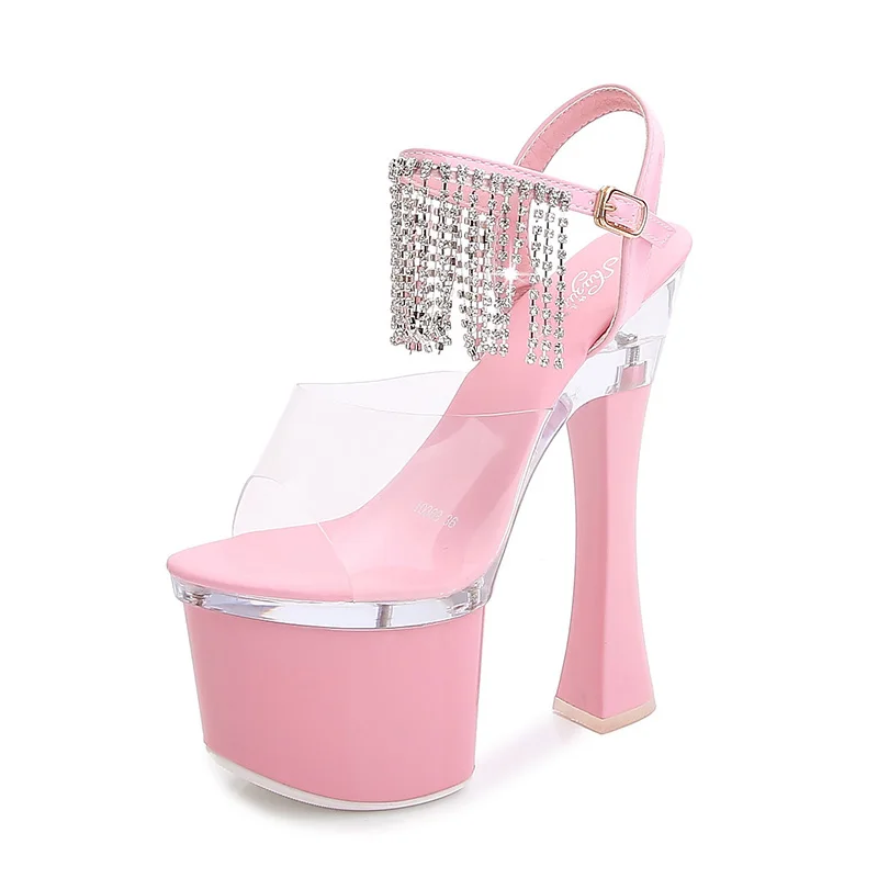 Summer Women Shoes 18CM Thick High Heels Peep Toe Sandals Platforms Diamond Tassels Ankle Strap Catwalk Shows PVC PINK RED Pumps