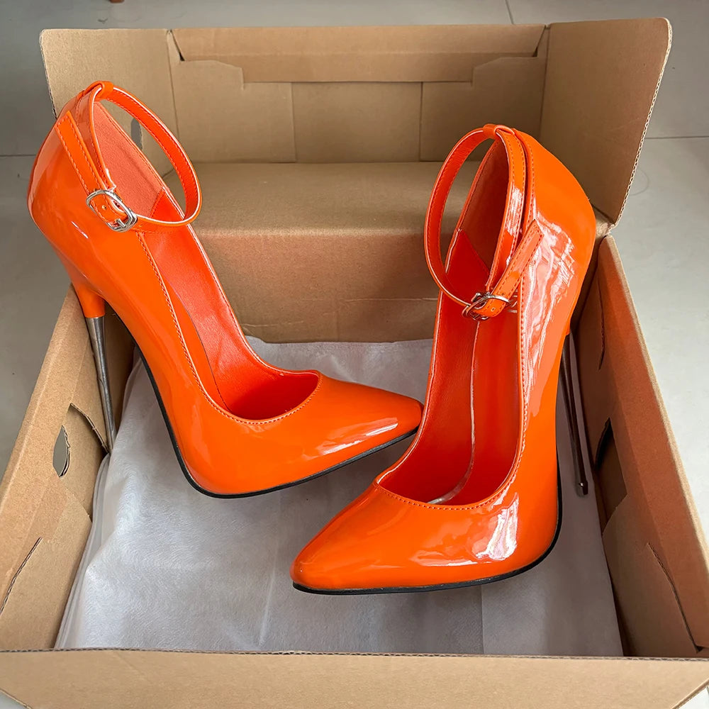 Super High Heels 16cm Stilettos Sexy Women Oange Dress Shoes Pumps Ankle Strap Fetish Party Unisex Man Shoes Big Szie 44 45 46