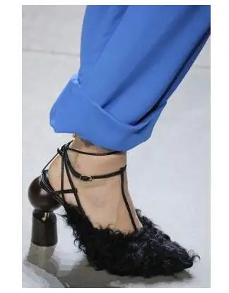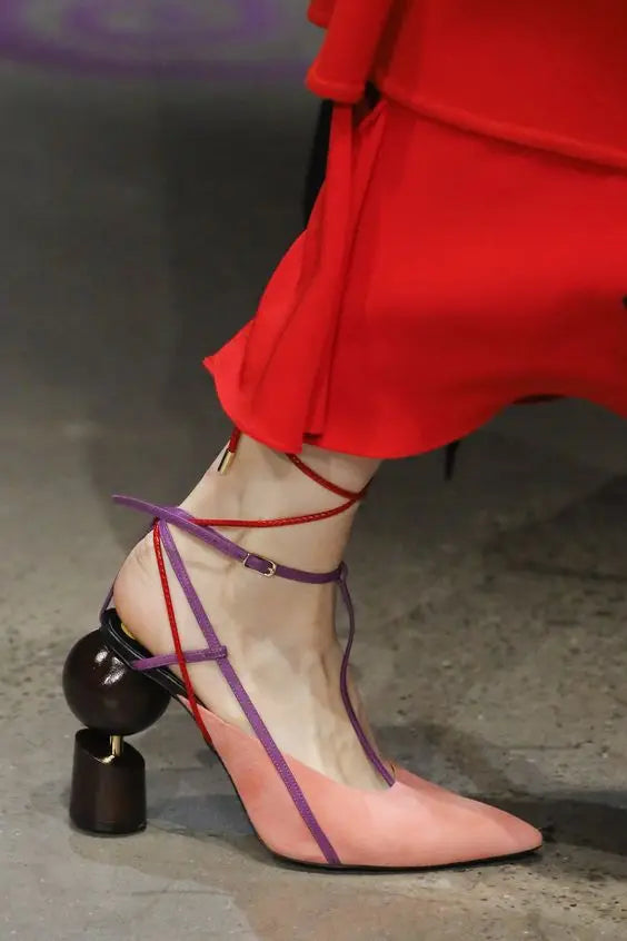 Name :Sestito The Latest Lady Strange Style High Heels Pointed Toe Sandals Woman Ankle Strap Mixed Color Runway Shoes Girls Slingbacks