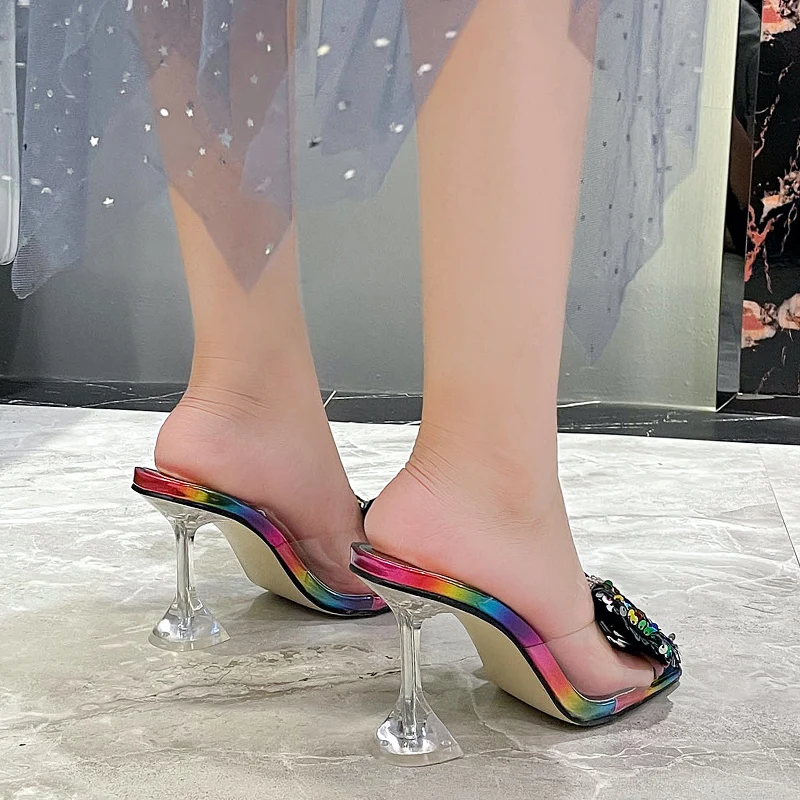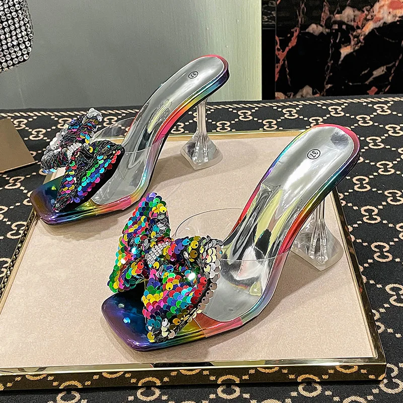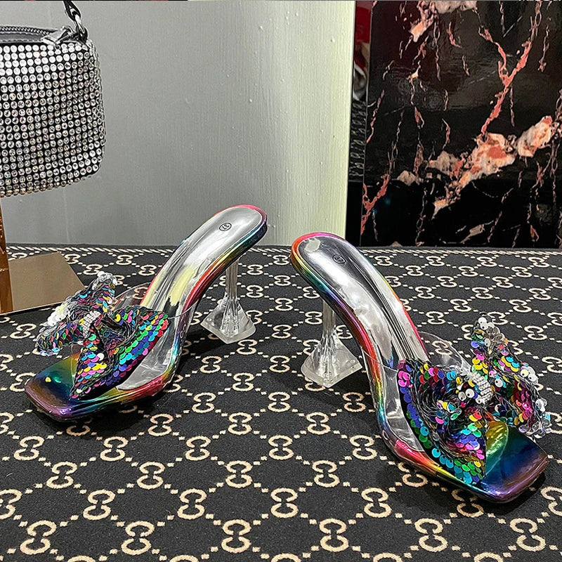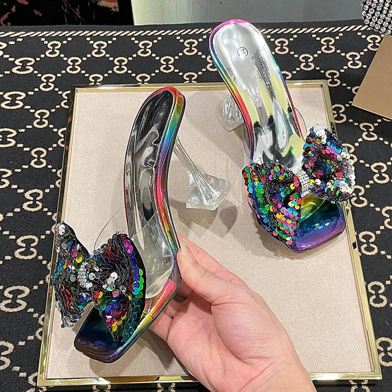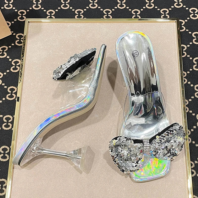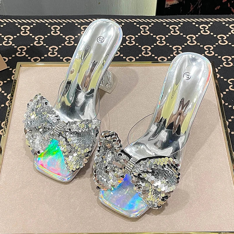 Transparent PVC Crystal Clear Heeled Women Slippers Fashion Fish Scales Bow High Heels Female Mules Slides Summer Sandals Shoes
