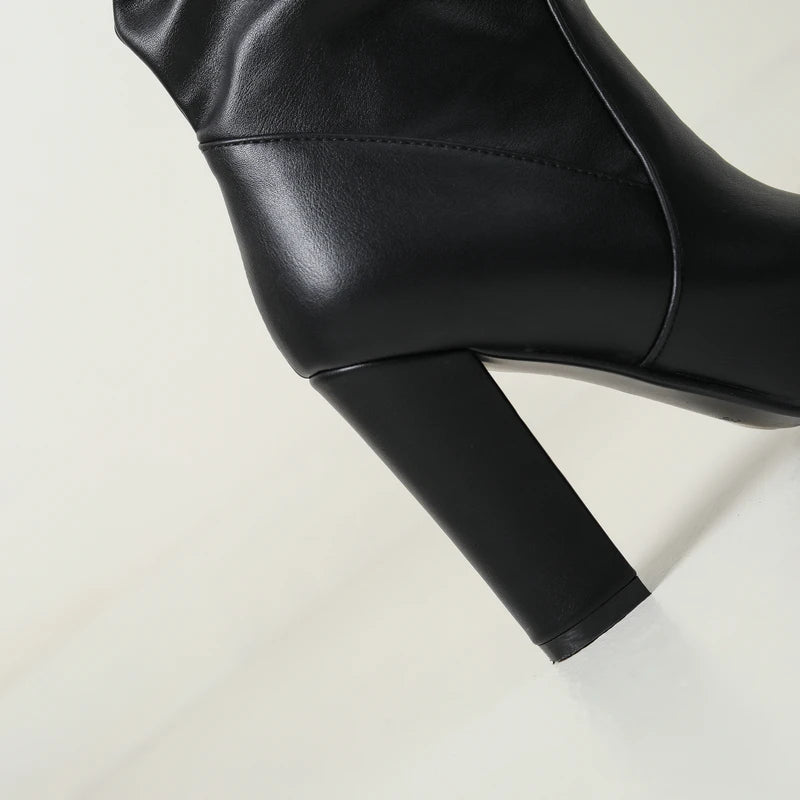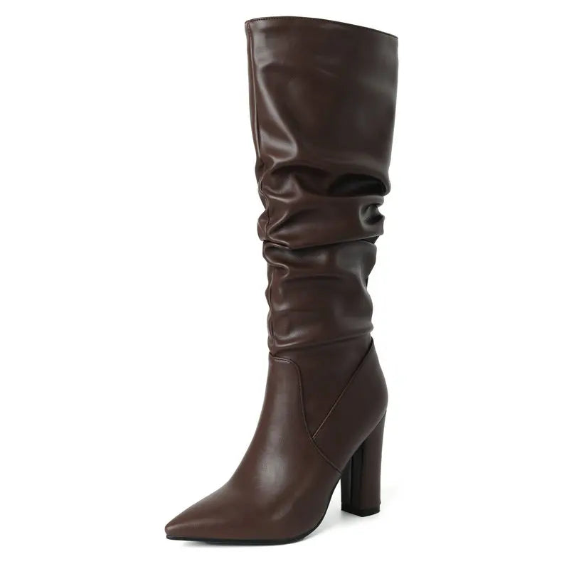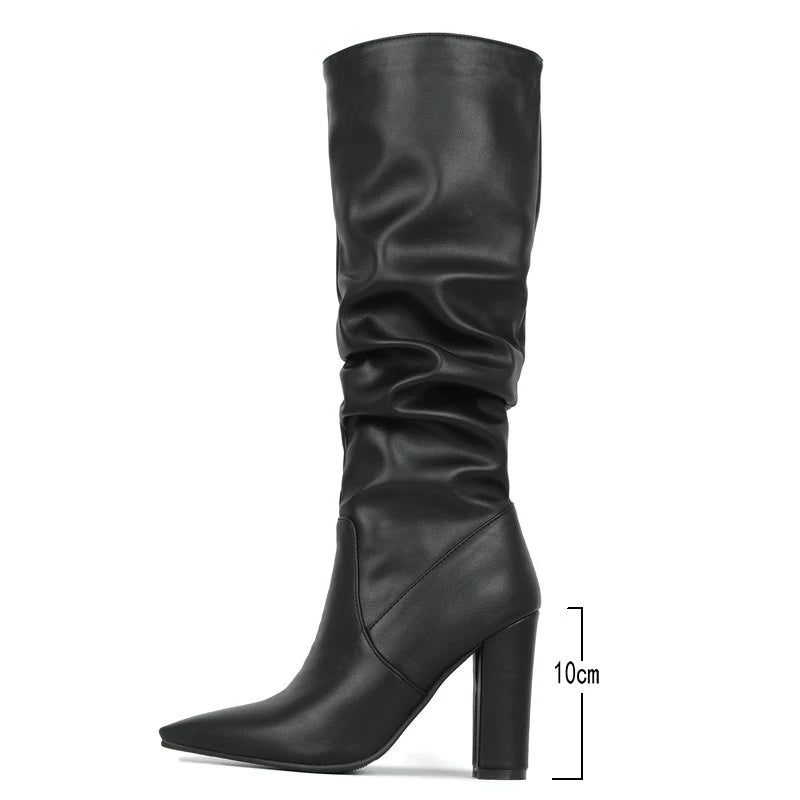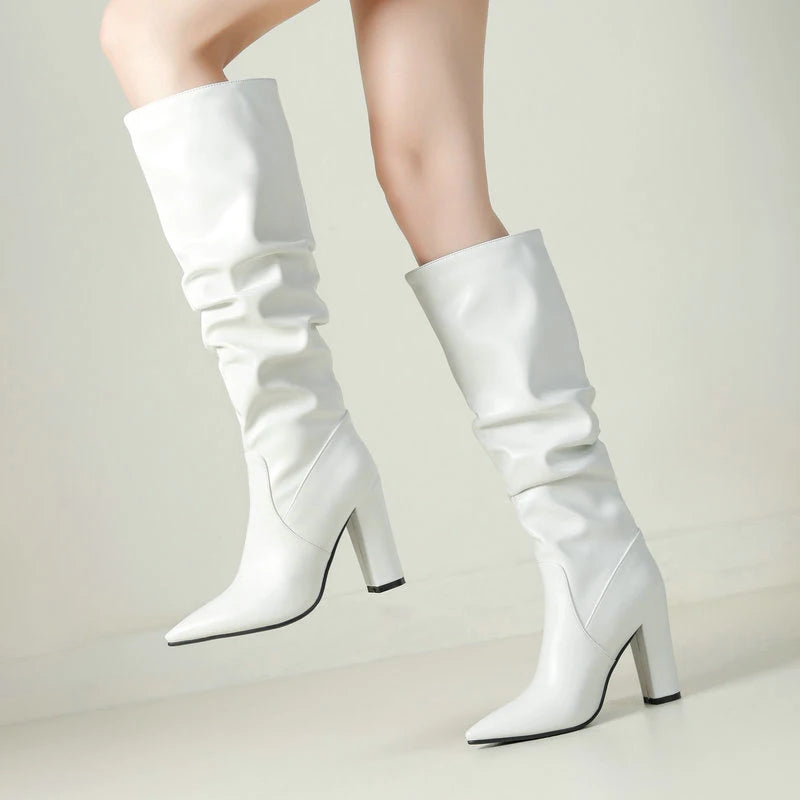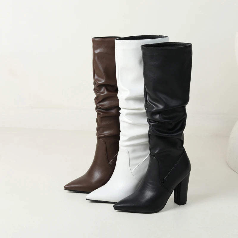 White Black Brown Women Knee Boots Pointed Toe Square High Heel Ladies Calf Boots PU Leather Slip on Pleated Women Boots Big Siz