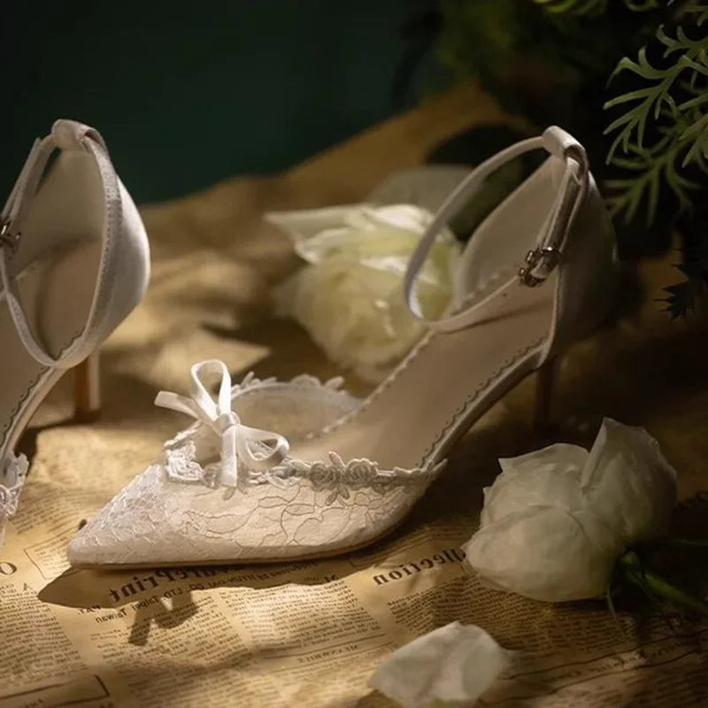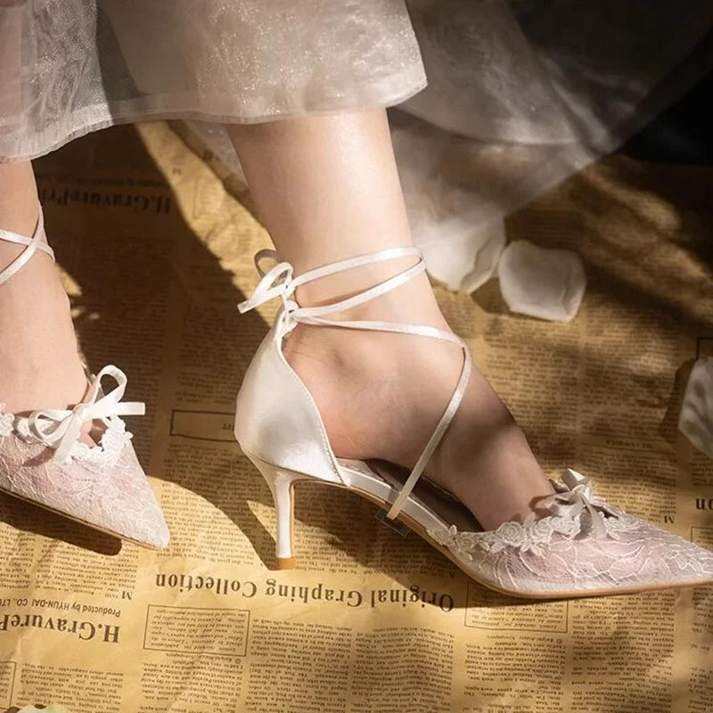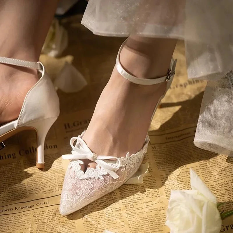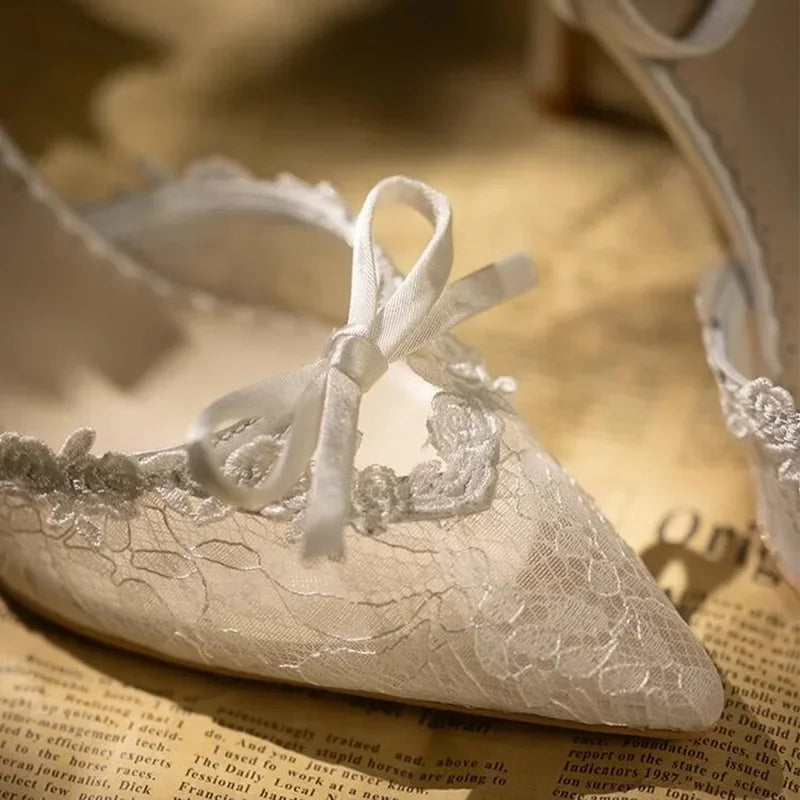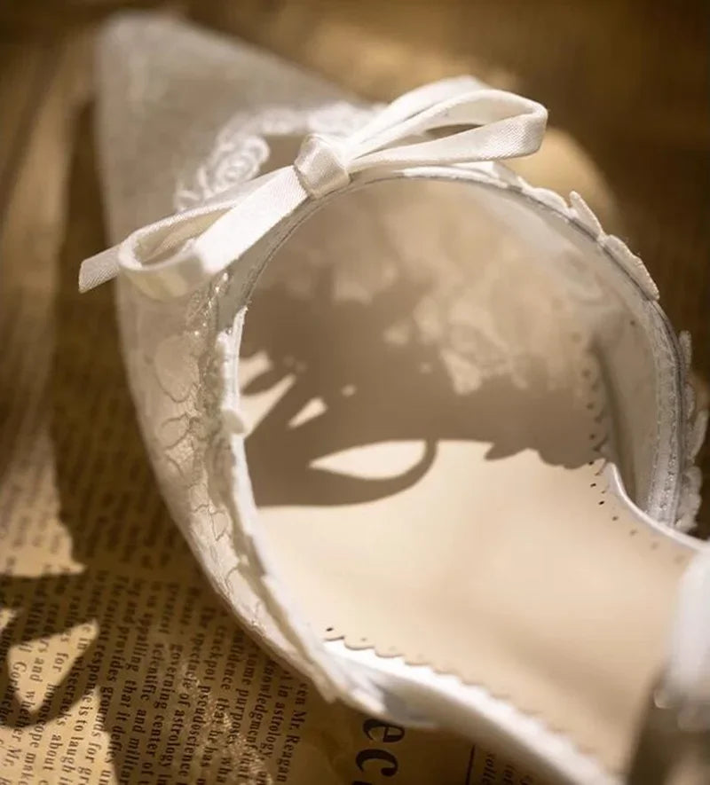 White Lace Bride Wedding Shoes Elegant Ribbon Bowtie Pointed Toe Hollow Thin Heels