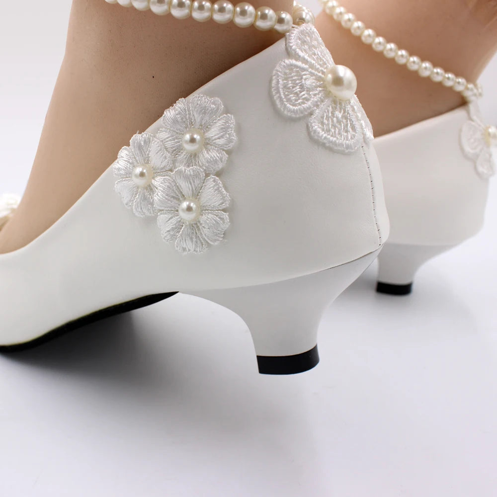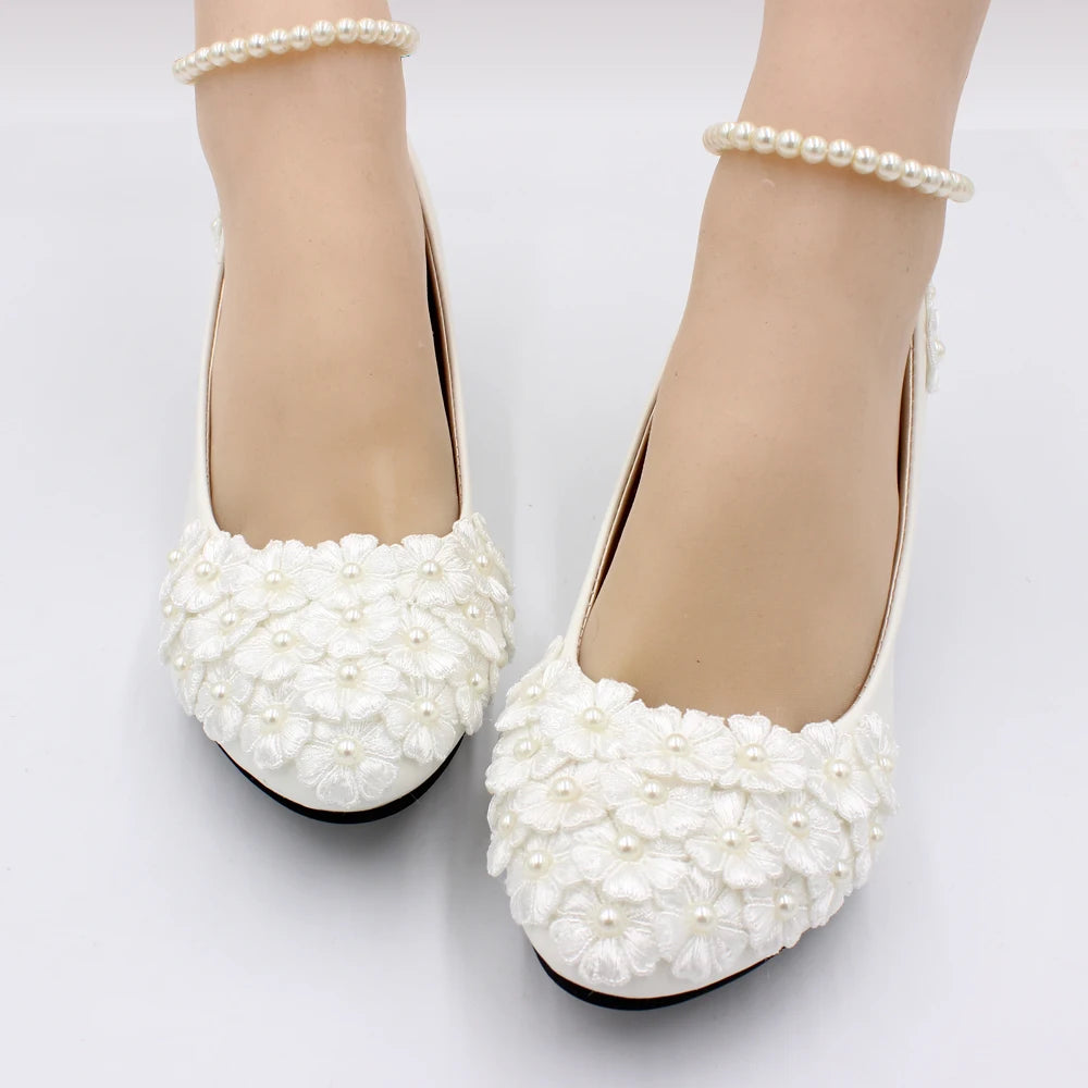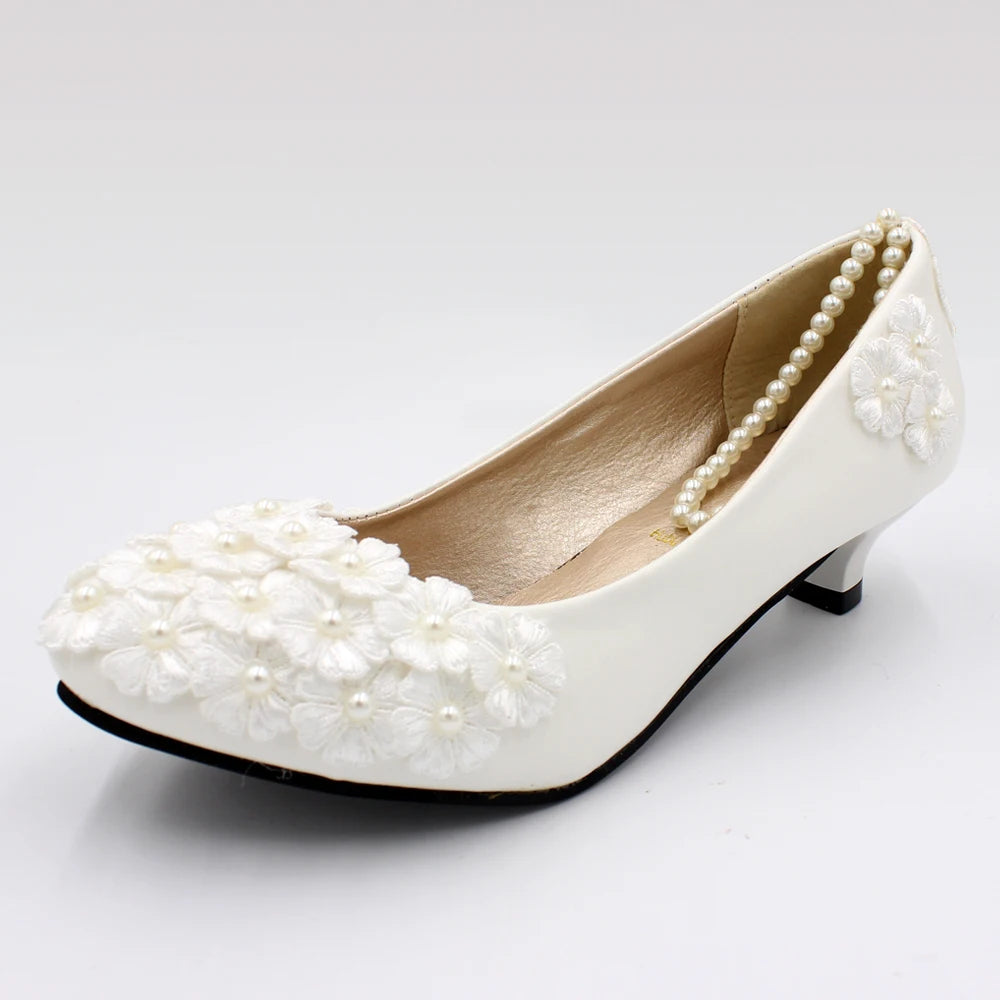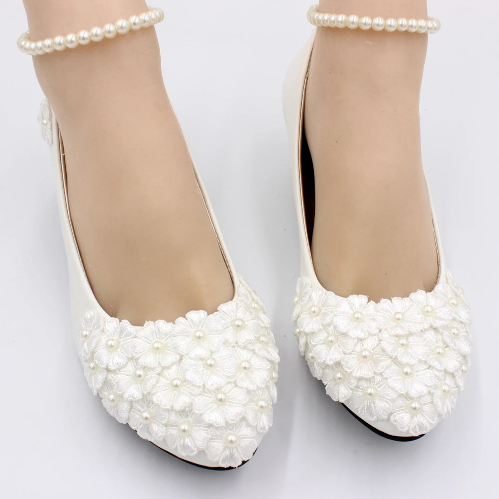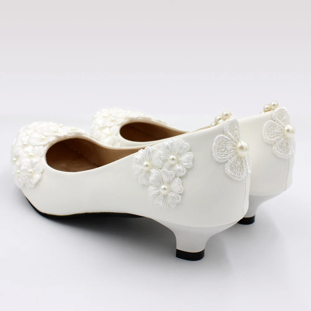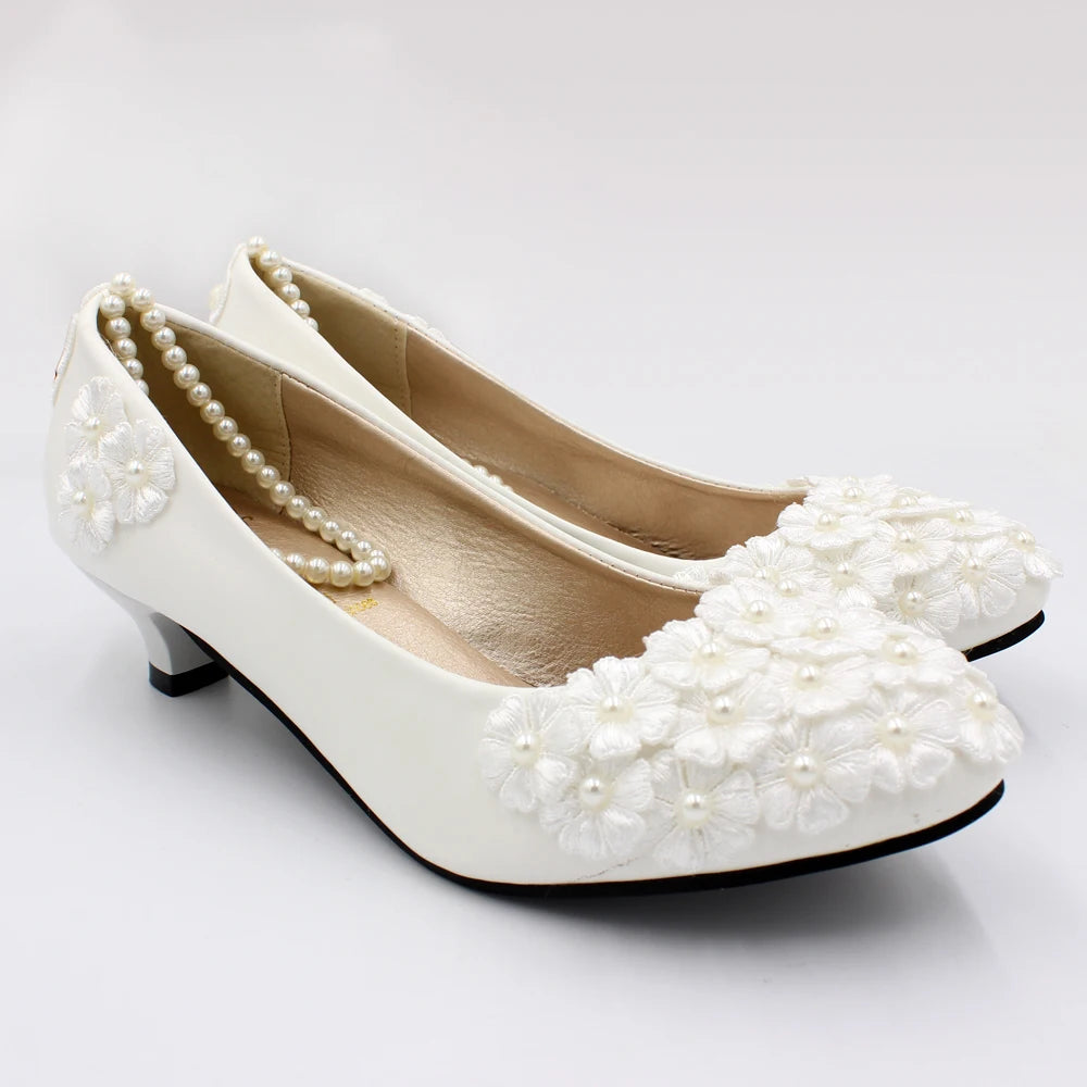 White low heel wedding shoes handmade decals decorated lace shoes