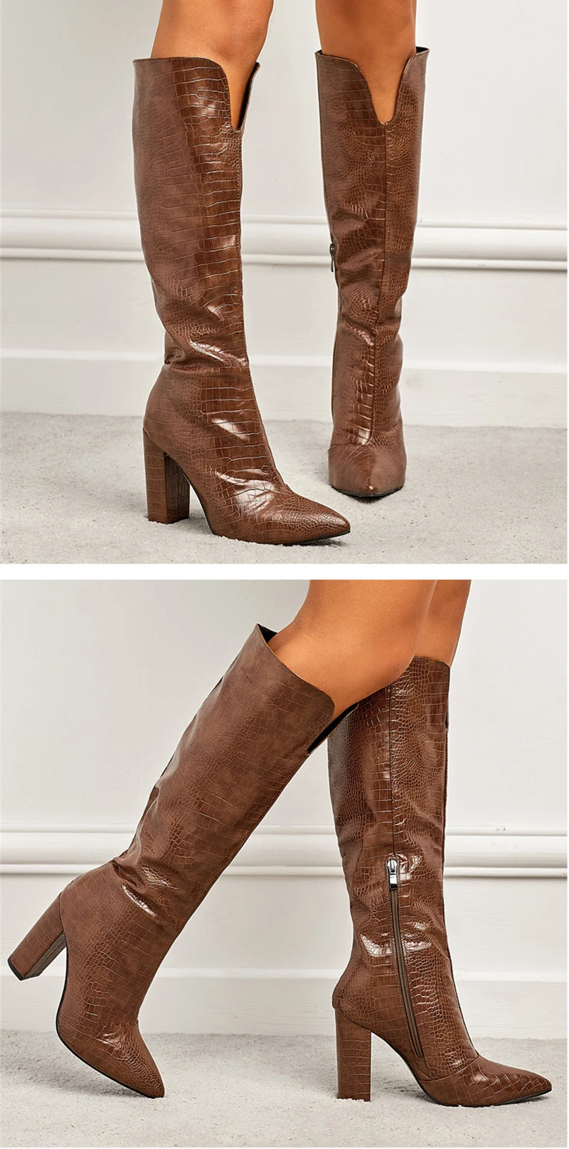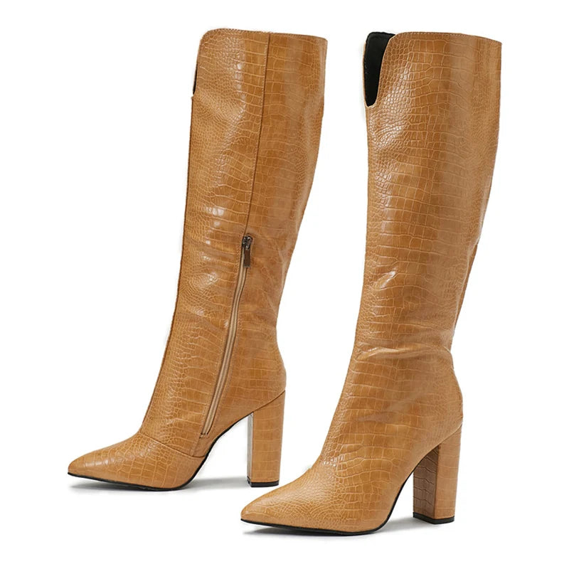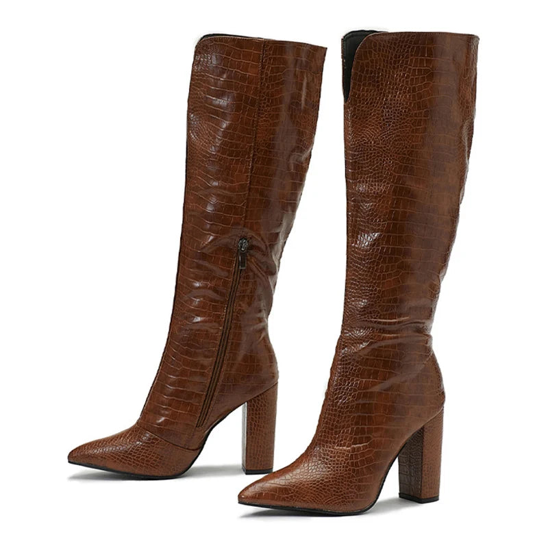 Winter Knee High Boots Women Black Square Heels Sexy Fashion Snake Print Leather Pointed Toe Zip Ladies Chunky Shoes Size42