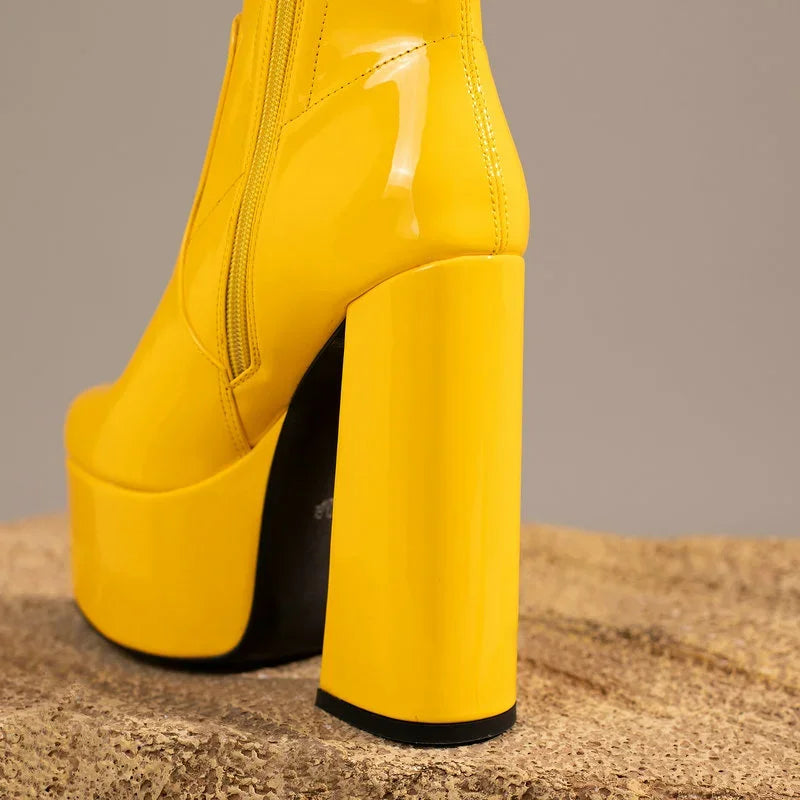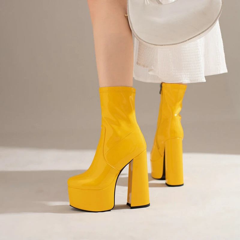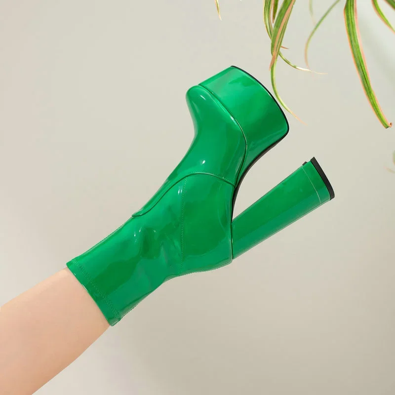 Winter Women Ankle Boots Platform Square High Heel Ladies Short Boots Patent PU Leather Round Toe Zipper Dress Women Boots