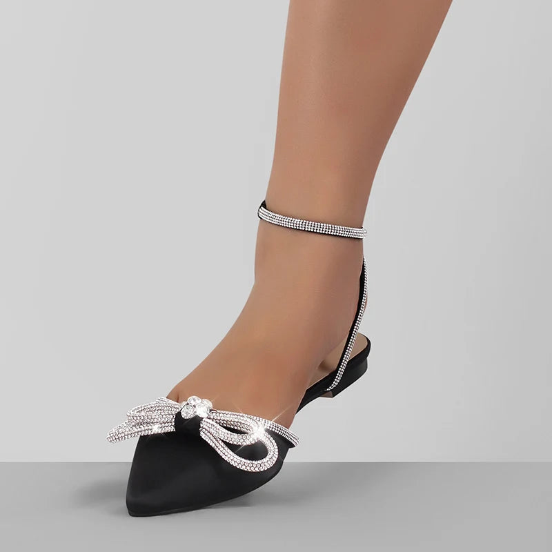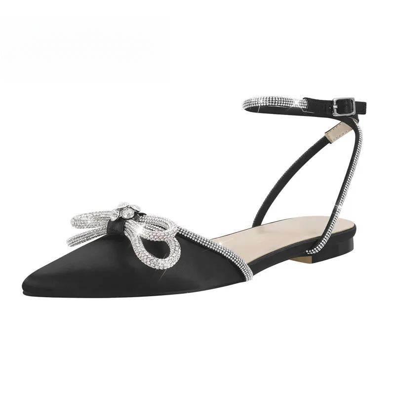 Woman Black Elegent Pointed Toe Rhinestone Bowknot Sandals Summer Big Size Flats
