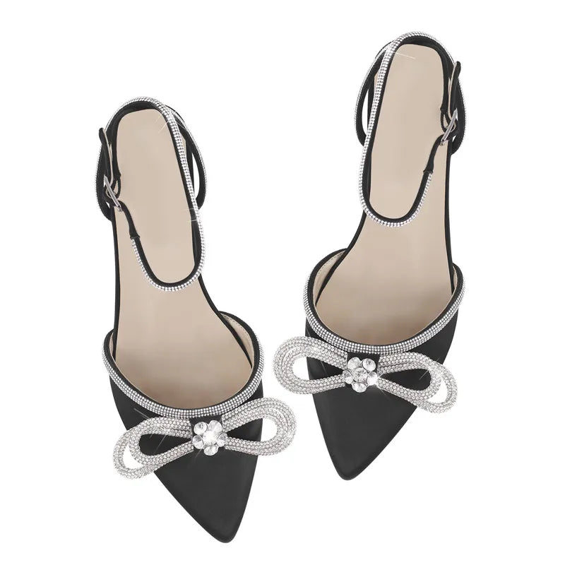 Woman Black Elegent Pointed Toe Rhinestone Bowknot Sandals Summer