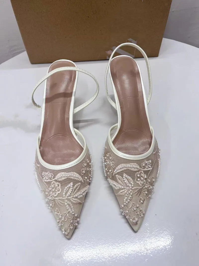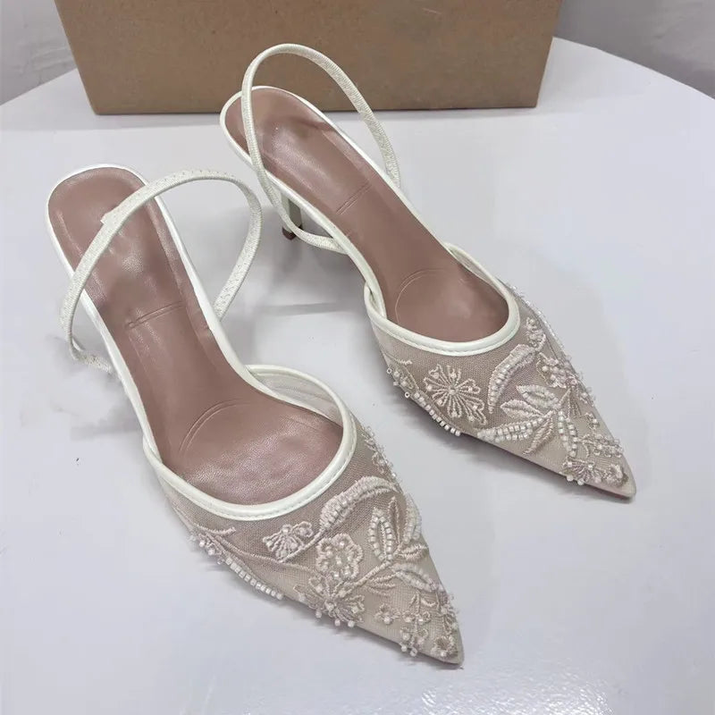 Woman Embroidered Mesh Open Heel Shoes Fashion Print Stiletto Women High-heel Pumps Sexy Pointed End Woman Sandals Mules
