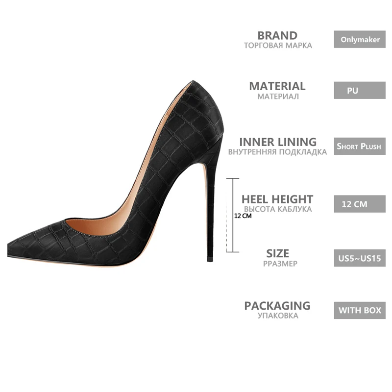 Women 12CM Black Sexy Pointed Toe High Heels Slip On Stiletto Pumps Office Party Wedding Large Size Classic Heels