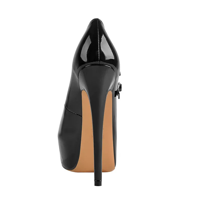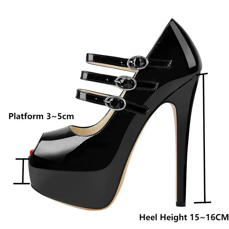Women Black Peep Toe Mary Jane Platform Buckle Pumps Ankle Strap Stiletto High Heels Dress Big Size Shoes