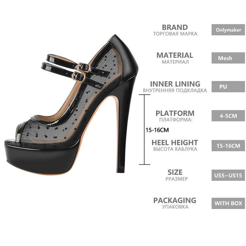 Women Black Platform Peep Toe Mesh Spike Pumps Sandals Thin High Heel Big Size Buckle Strap Party Shoes