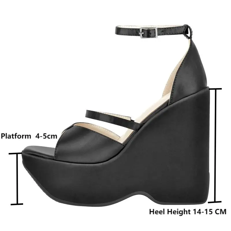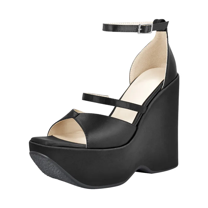 Women Black Platform Wedge Buckle Sandals Dressy Anti Slip Comfortable Ankle Wrap Simple Design Party Comfy Shoes