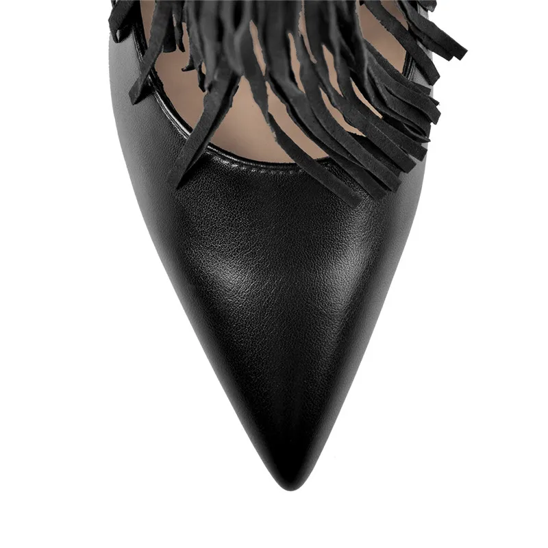 Women Fringe Pointed Toe Stiletto 12CM Heel Pumps Black Ankle Strap Back Zipper Shoes