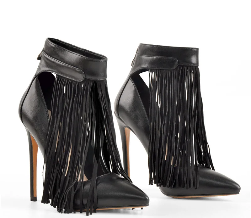 Women Fringe Pointed Toe Stiletto 12CM Heel Pumps Black Ankle Strap Back Zipper Shoes Big Size Heels