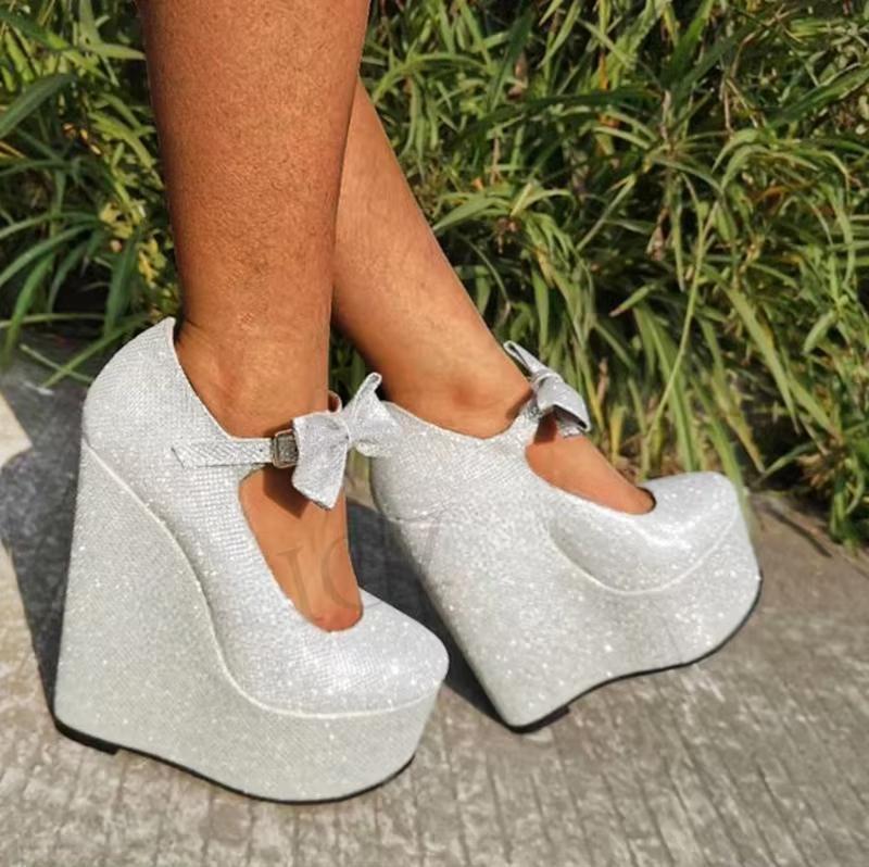 Women Heels Platform Wedge Mary Jane Silver Bling Ladies Pumps Evening Party Shoes Woman Zapatos Mujer Big Size 50 52