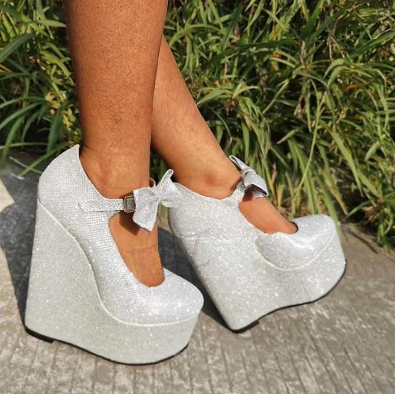 Women Heels Platform Wedge Mary Jane Silver Bling Ladies Pumps