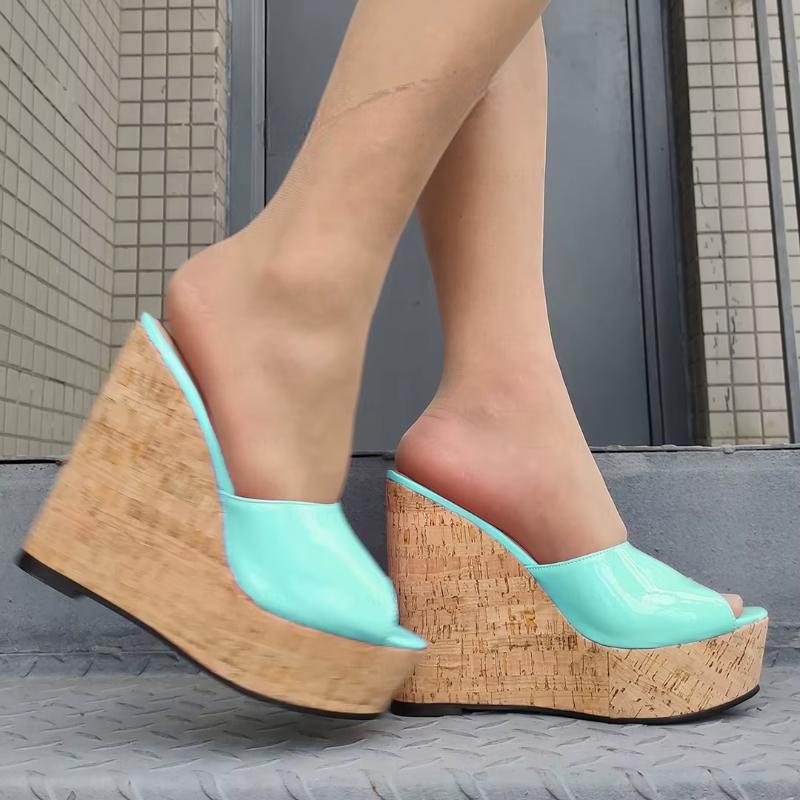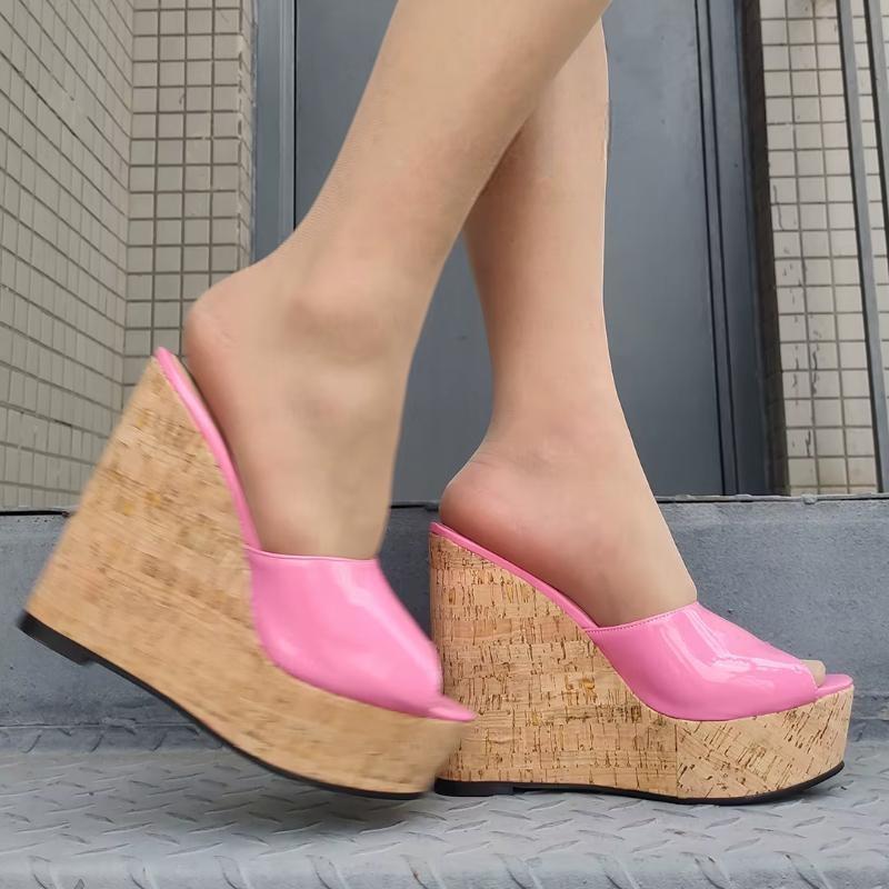 Women Platform Wedges Shiny Sandals Peep Toe Cork Print Height Increase Summer Mules Shoes Woman Big Size 42 44 50 52