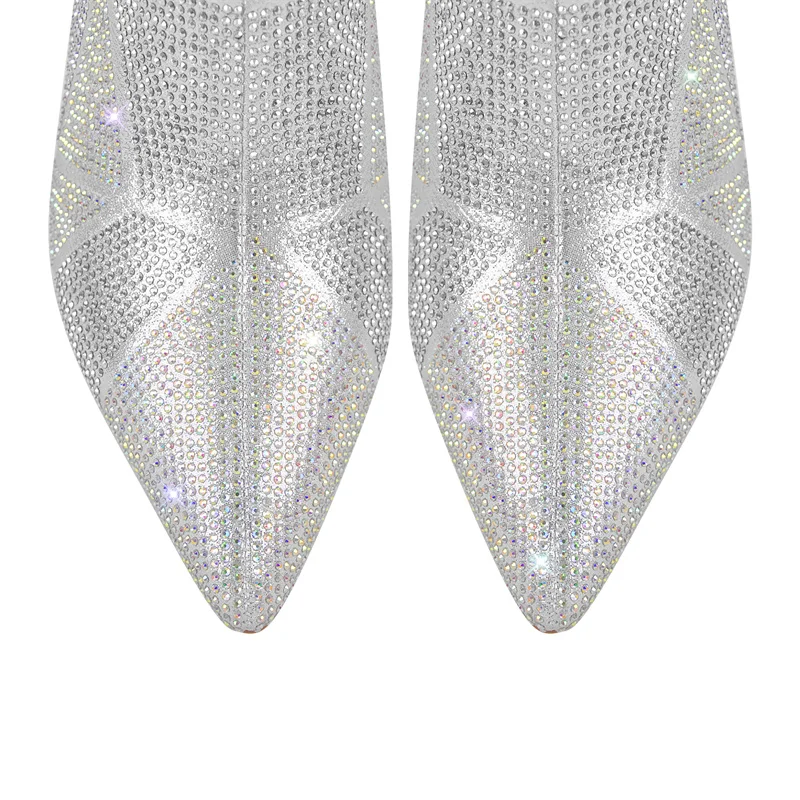 Women Rhinestone Ankle Boots Pointed Toe Black Block Heel Pull-On Glitter Handmade Female Boots