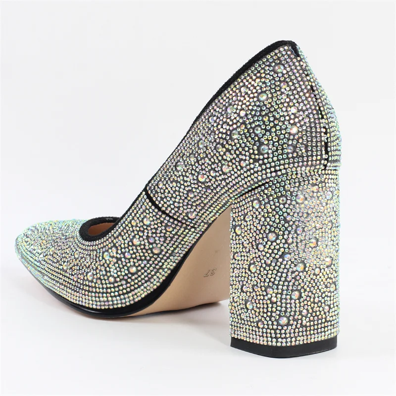 Women Rhinestone Pointed Toe Chunky Heel Pumps Slip On Thick Heel Wedding Office Dress Big Size Lady Shoes
