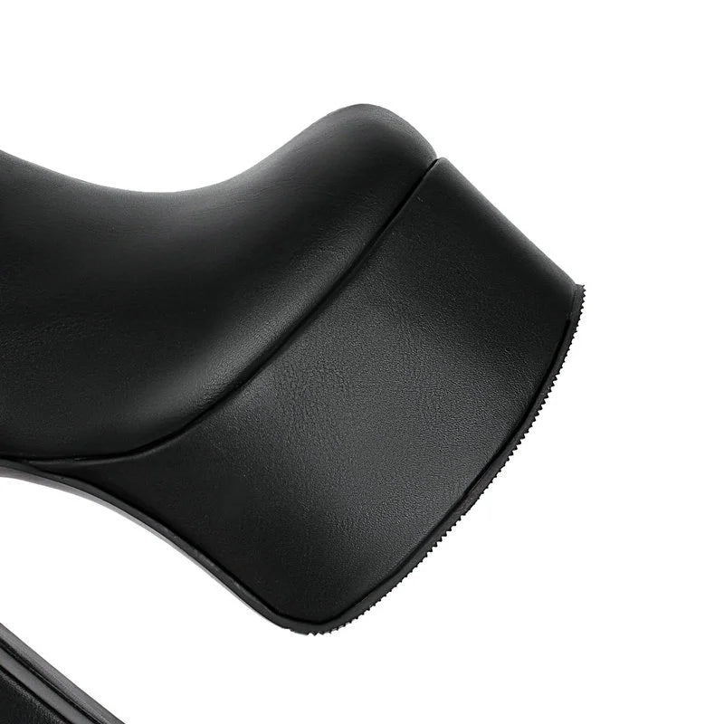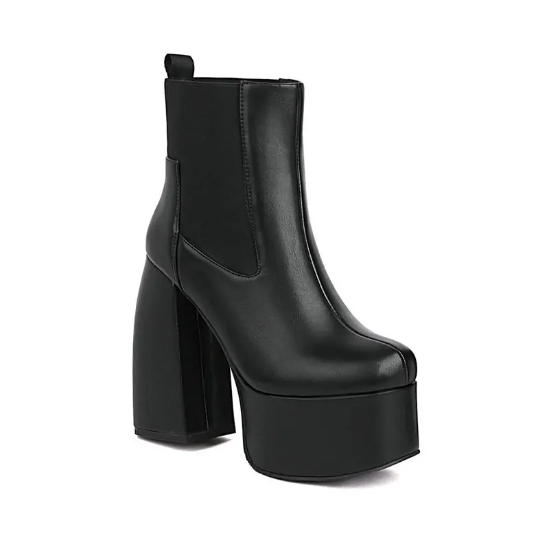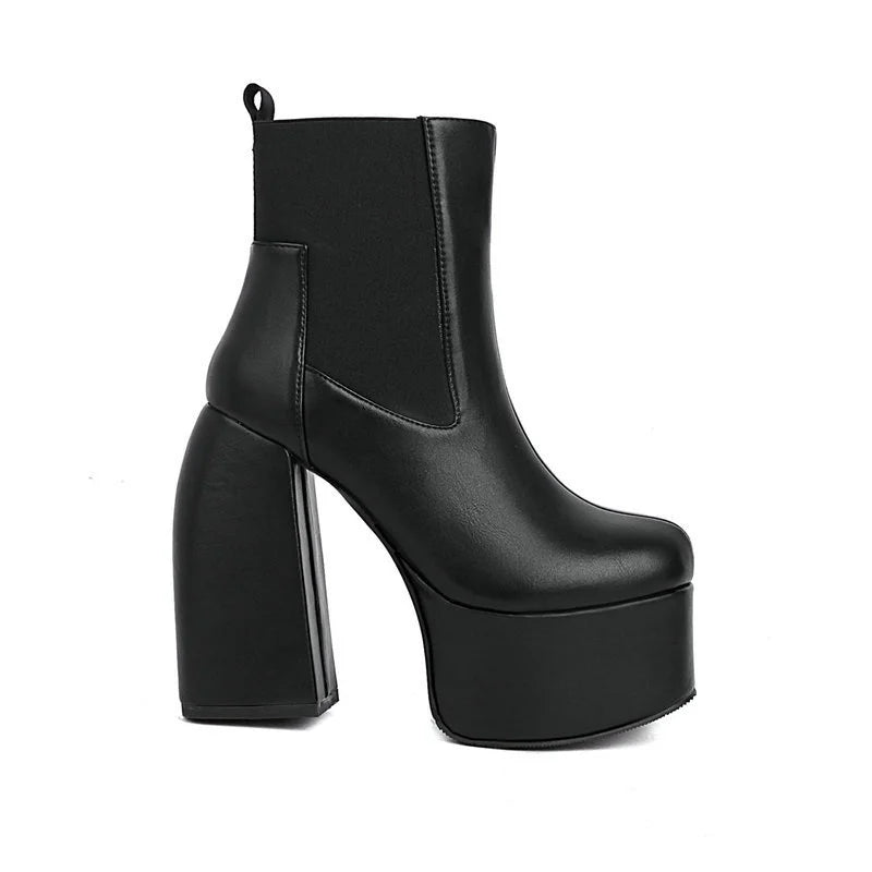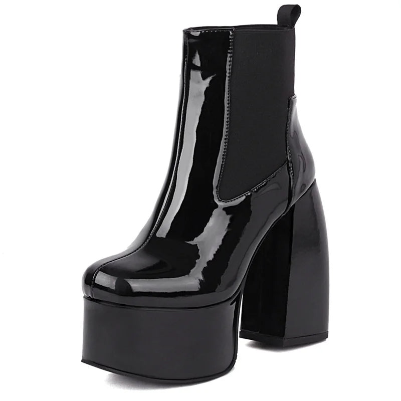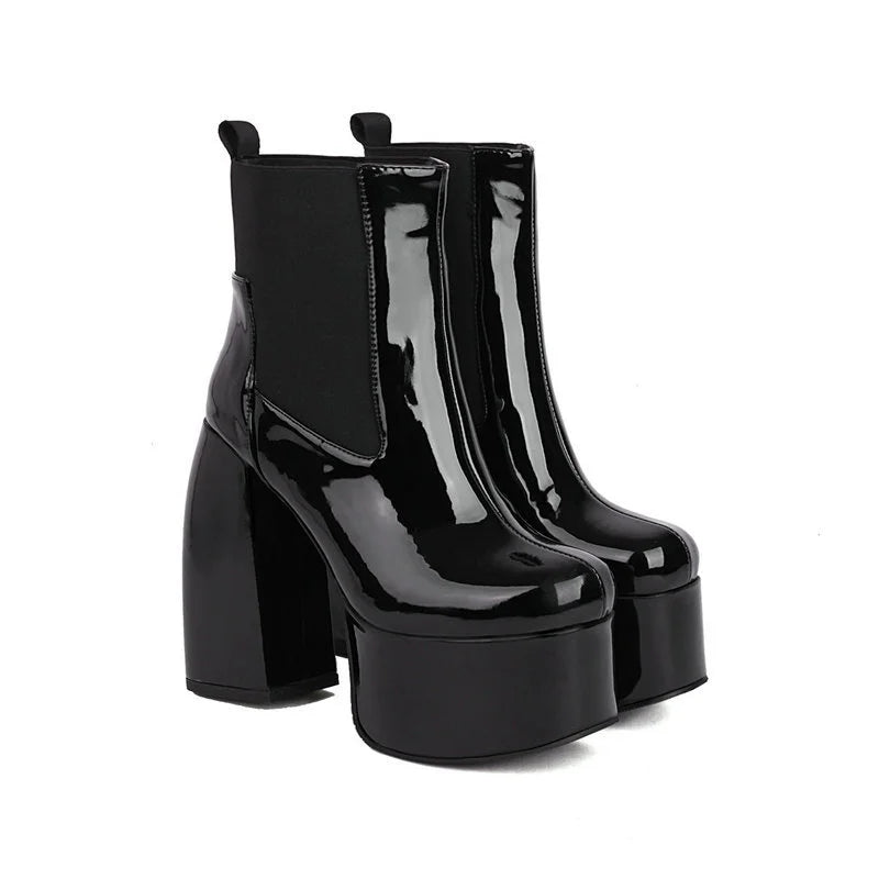 Women Round Toe Black Patent Leather PU Ankle Platform Boots Thick High Heel